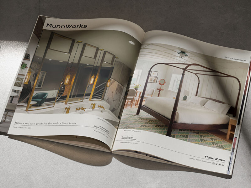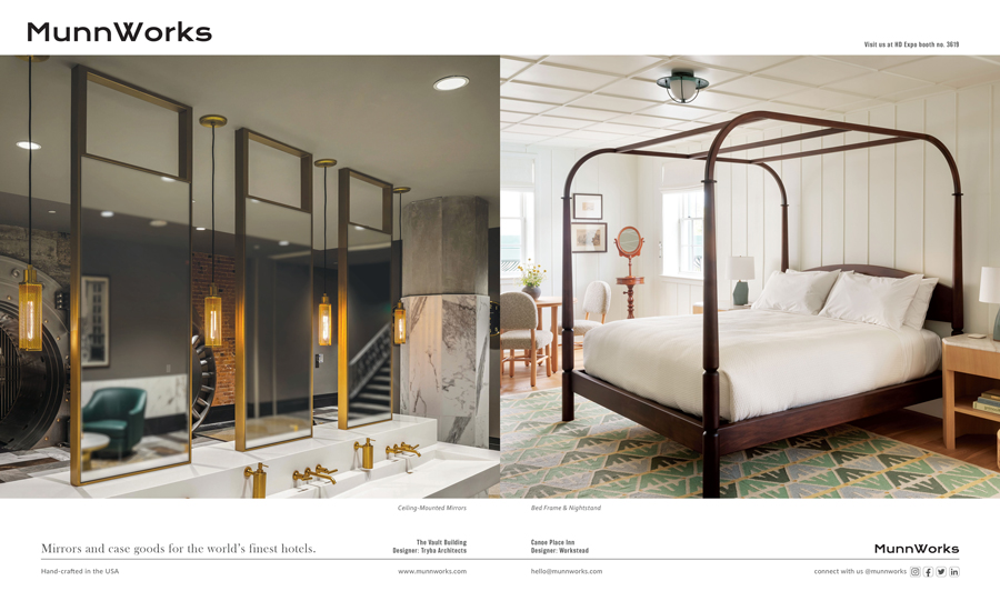 MunnWorks in Hospitality Design Magazine April 2023 Issue Products Featured: Ceiling-mounted mirrors in The Vault Building (Denver, CO).Colonial-style bedframe in Canoe Place Inn (Hampton Bays, NY).