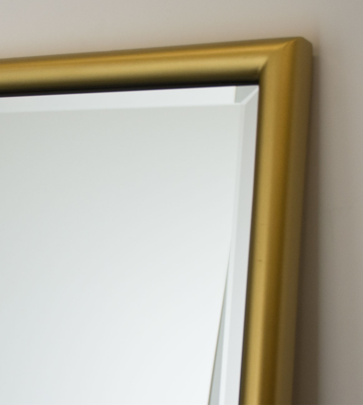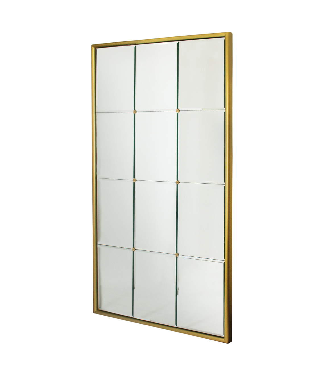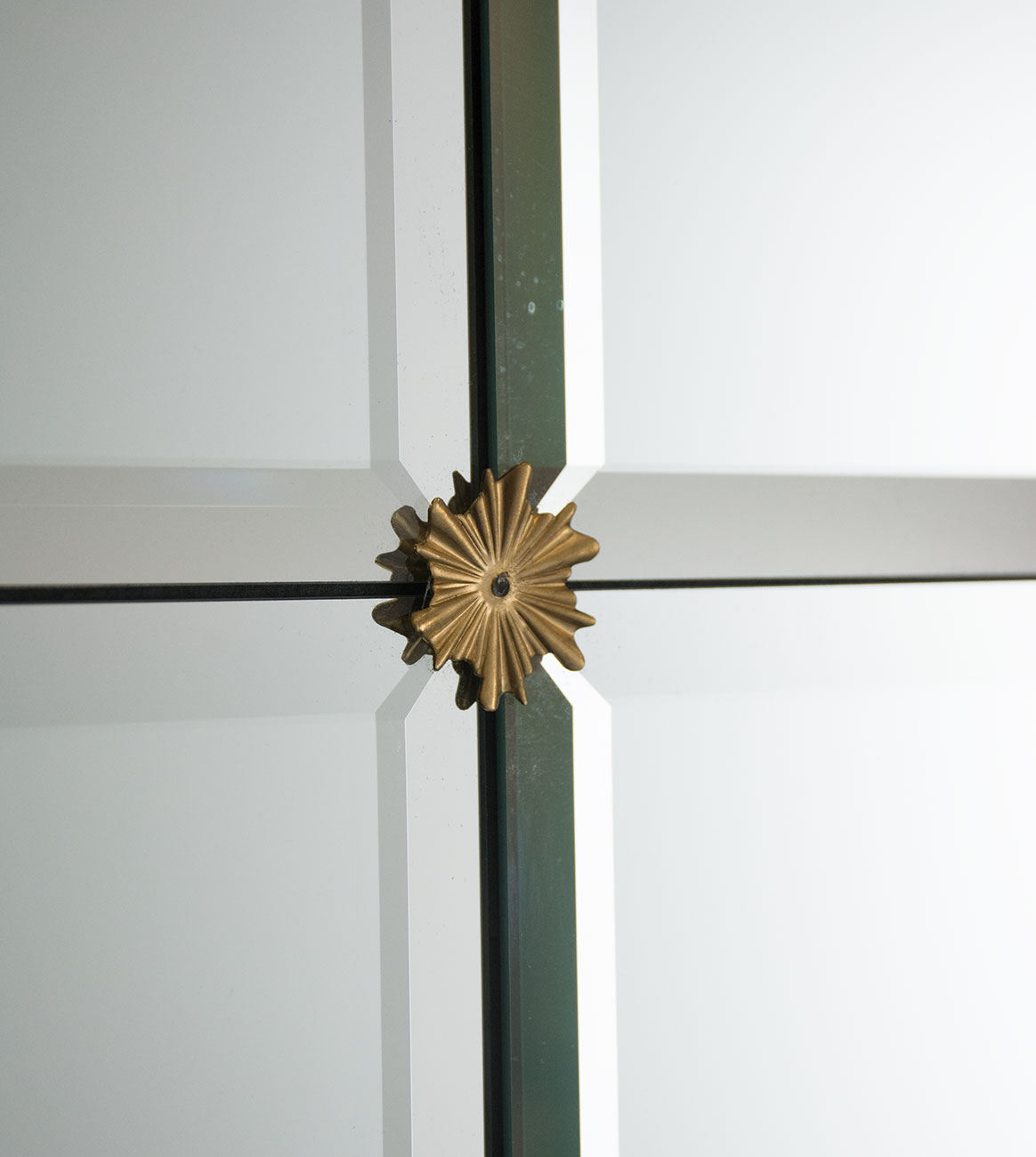 A closed corner wood frame surrounding a mirror grid, each individual mirror is beveled with custom rosettes at the points.