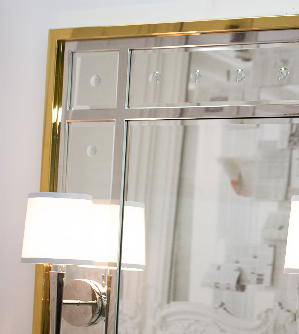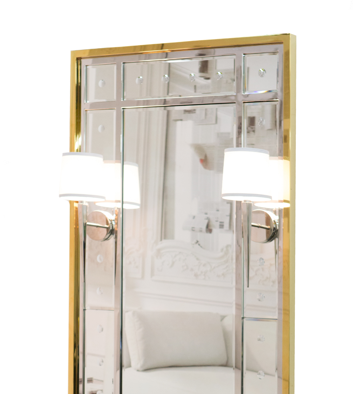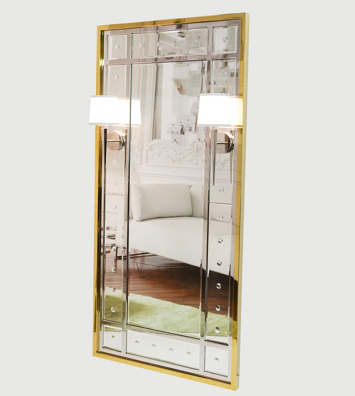 A play on the Italian word for “tall,” this mirror features built-in sconces as part of a glittering but tailored full-length mirror, providing functionality as much as art and ambiance.