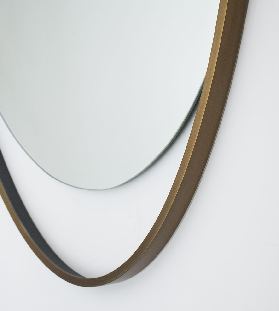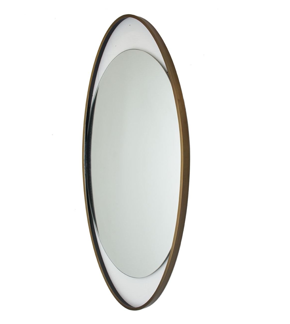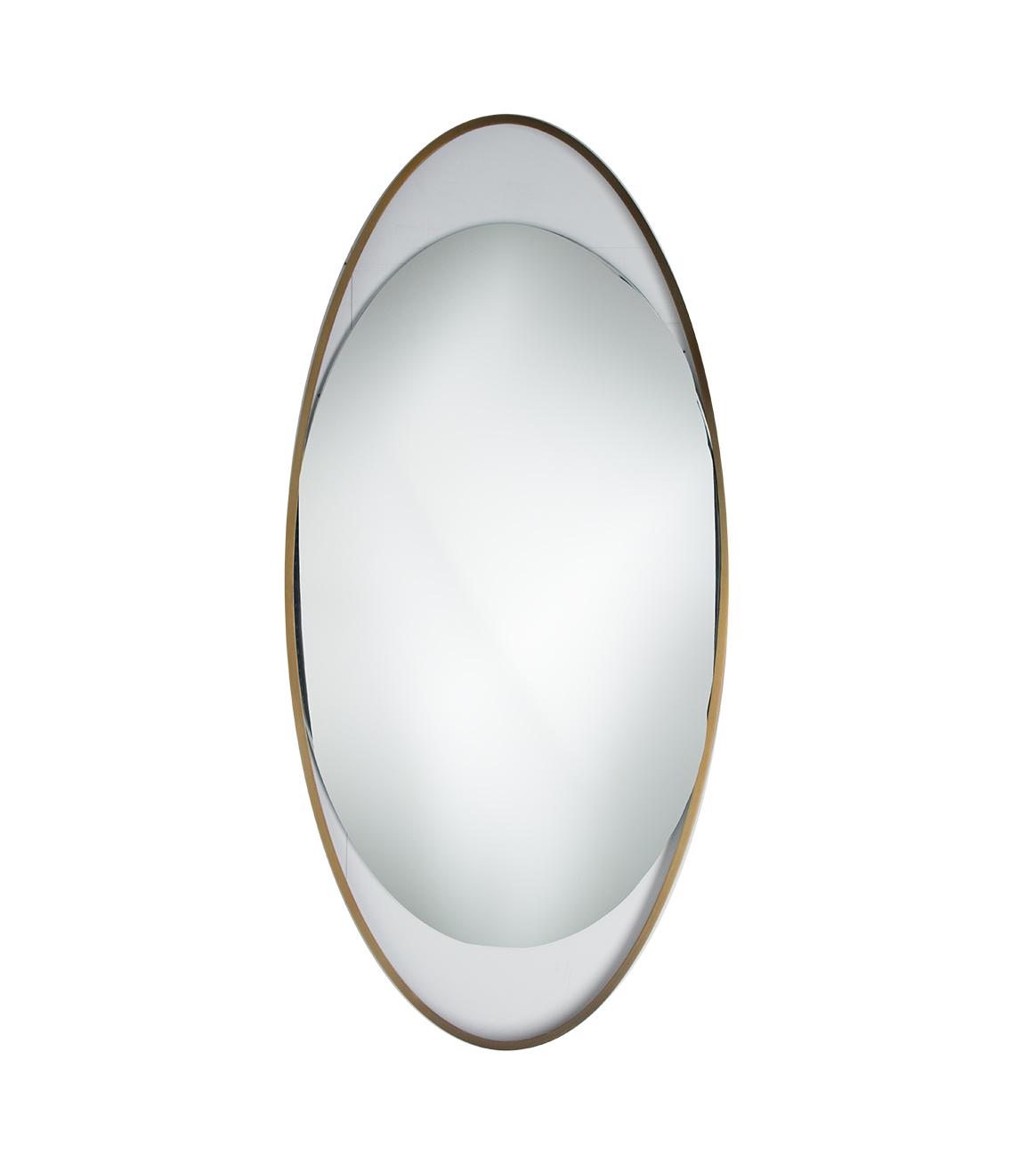 A floating oval mirror set in a larger oval brass plated stainless steel frame with open areas at the top and bottom.