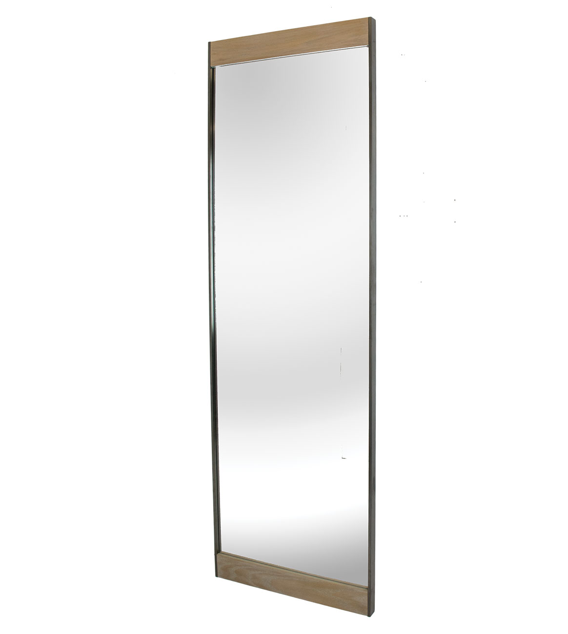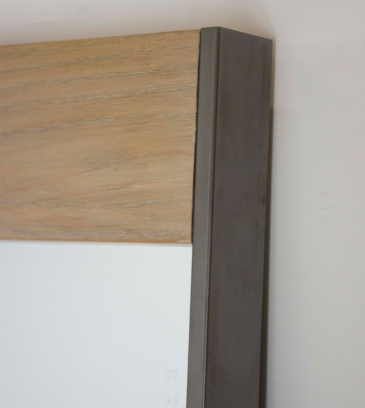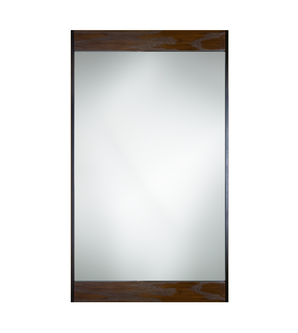 This full-length mirror has custom-finished wood at the top and bottom. A blackened steel metal frame is featured at its left and right sides.