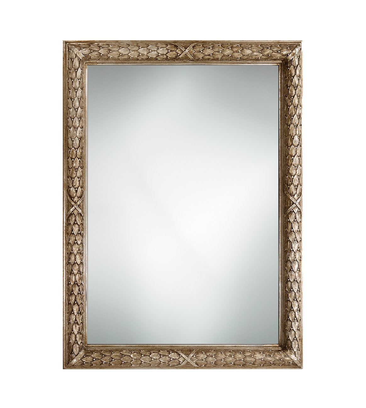 Classical Greek ornament with lattices at corners and centers, antiqued silver metal leaf finish.