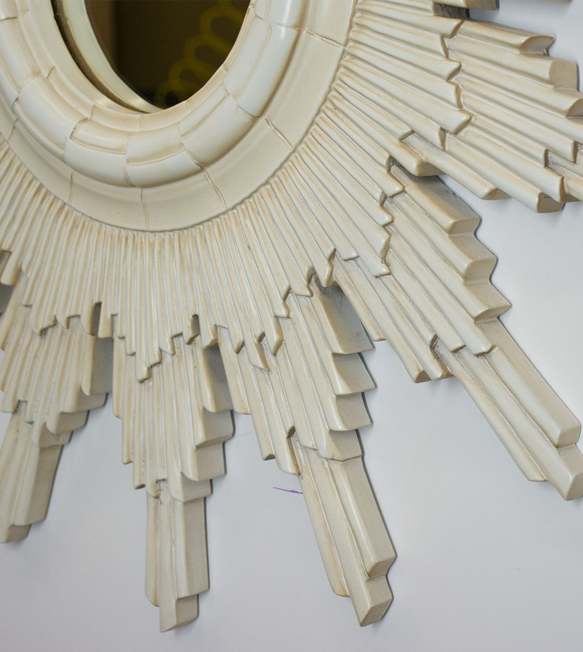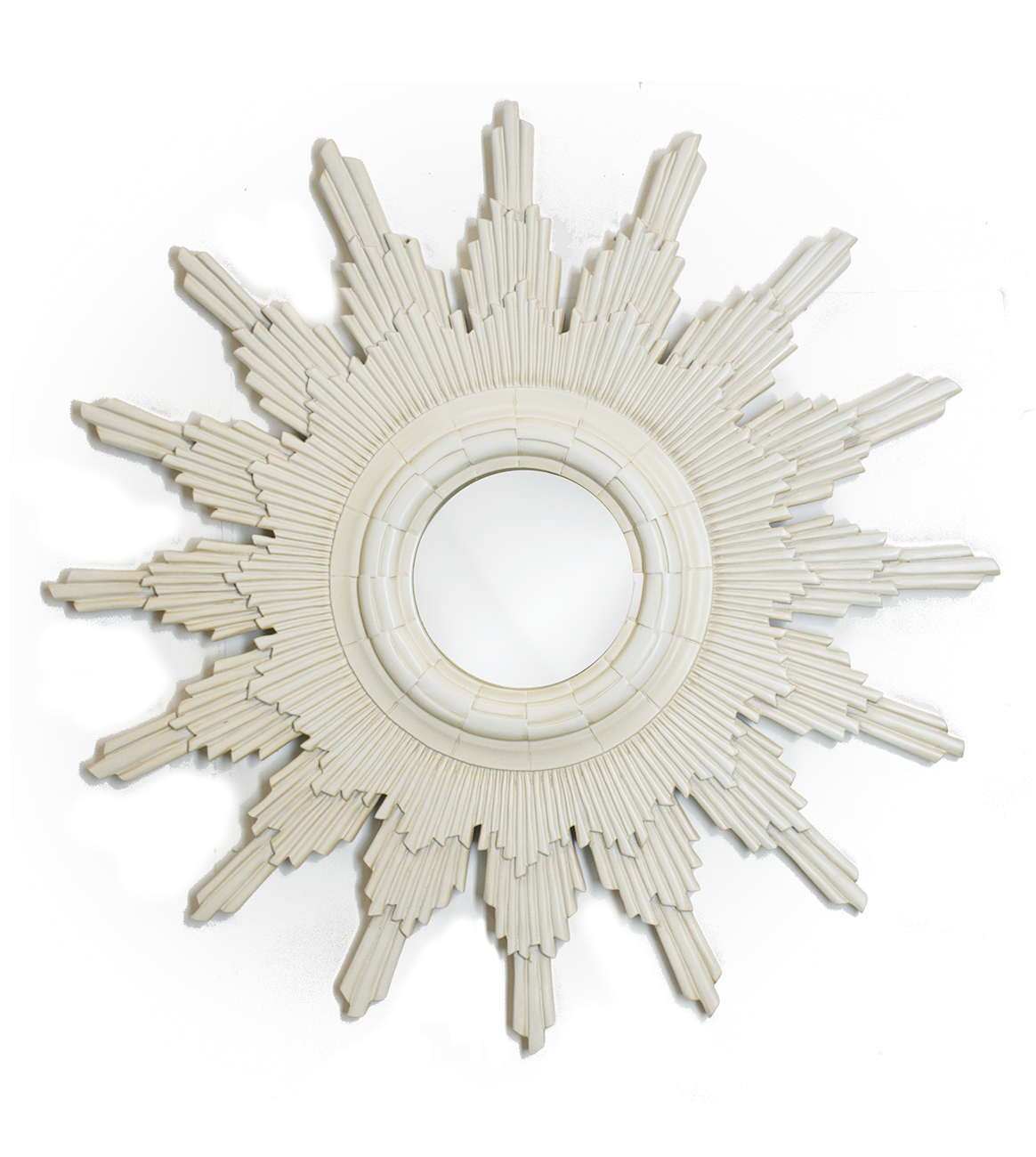 Influenced by Aztec design this round mirror is surrounded by three layers of carved rays finished in antique white.