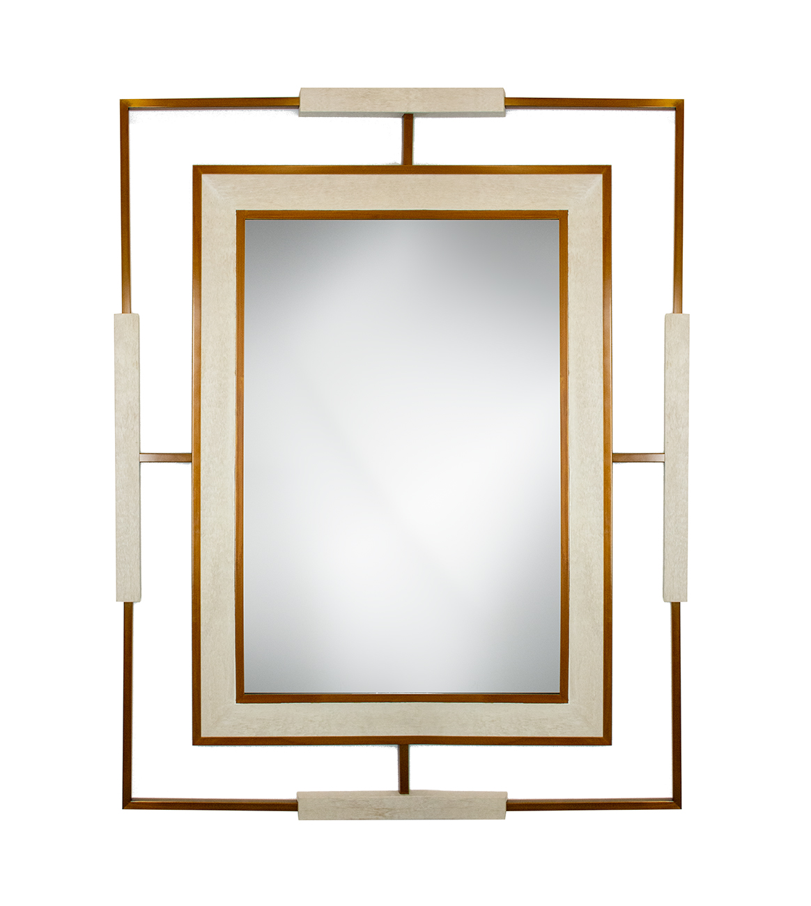 This rectangular mirror is set in a double frame featuring closed corners, a two-tone finish, and decorative contrasting-color cuffs at the outer frame.