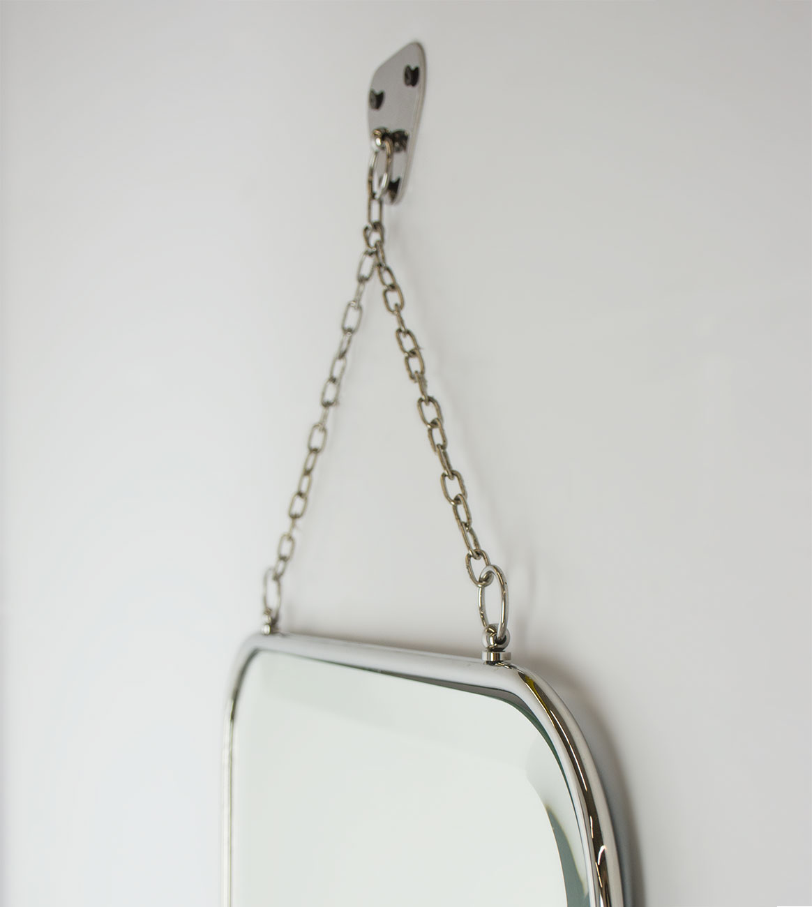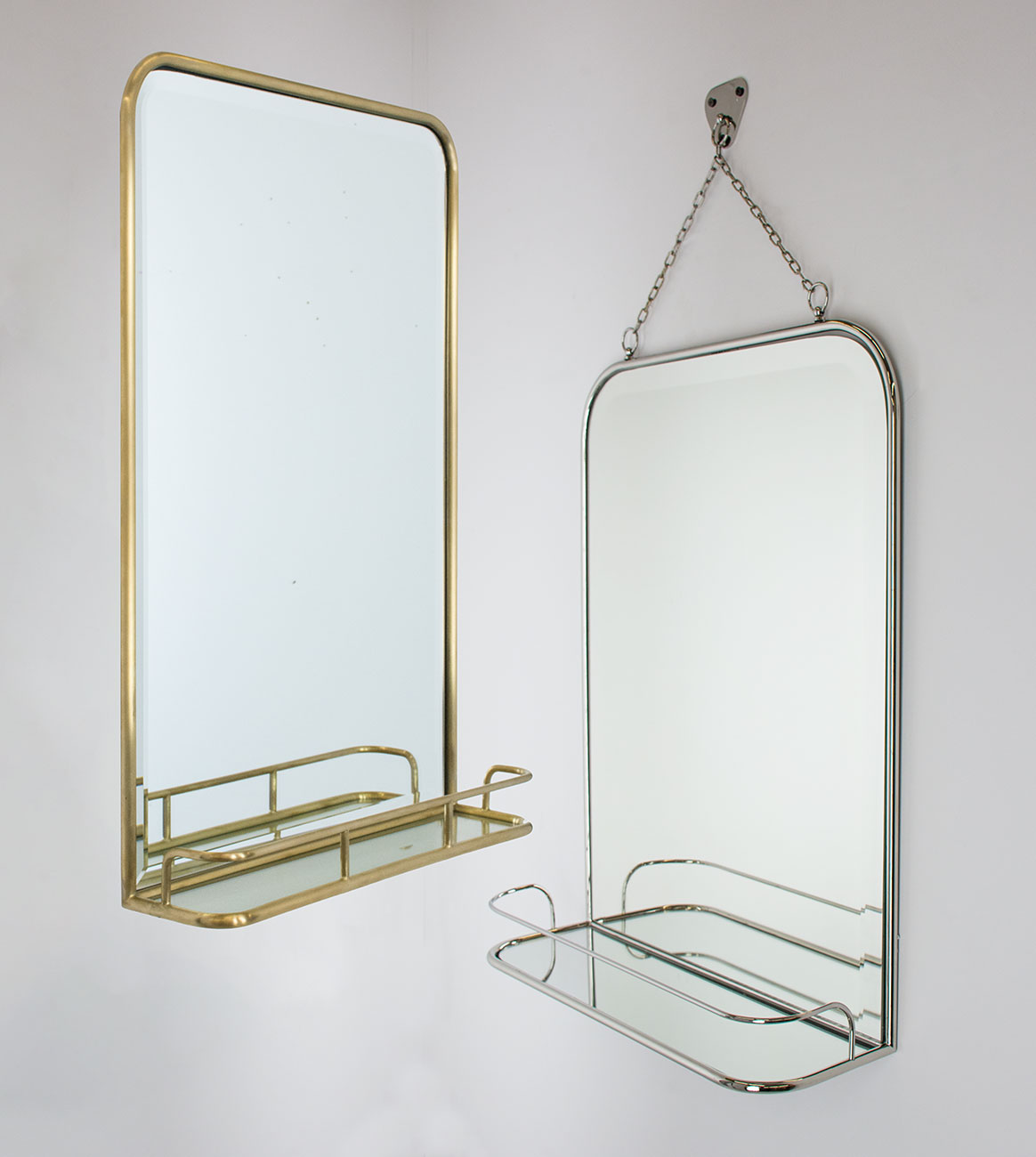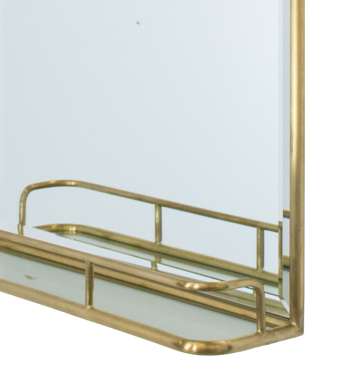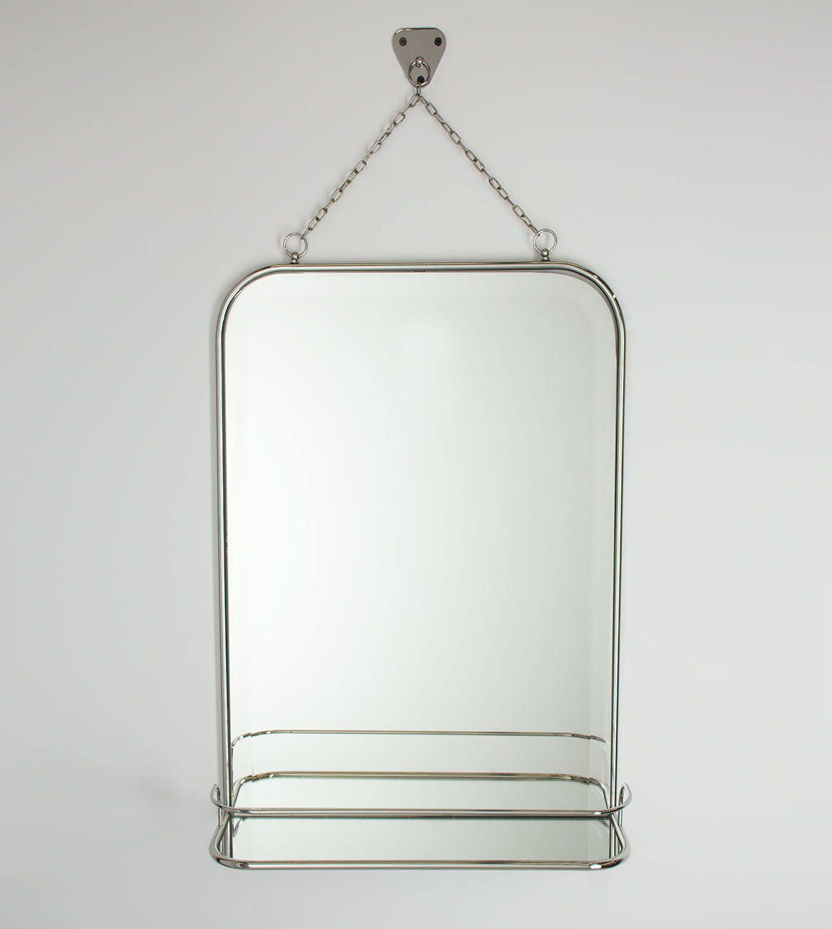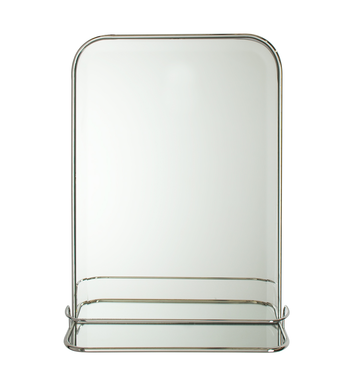 Rectangular mirror with tubular metal frame and rounded corner shelf.