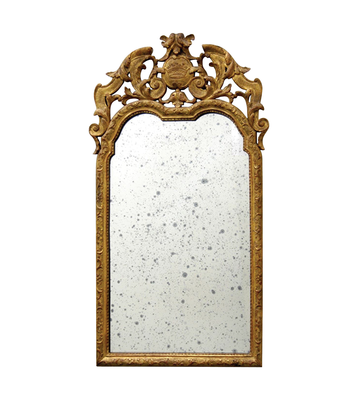 23 karat gold on a custom carved hardwood frame featuring an antiqued mirror (shown).