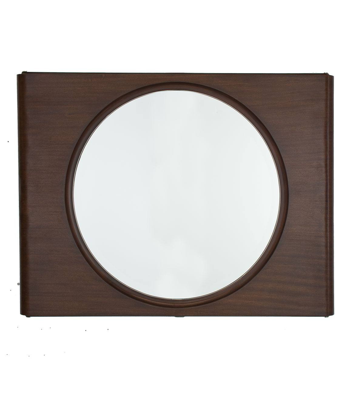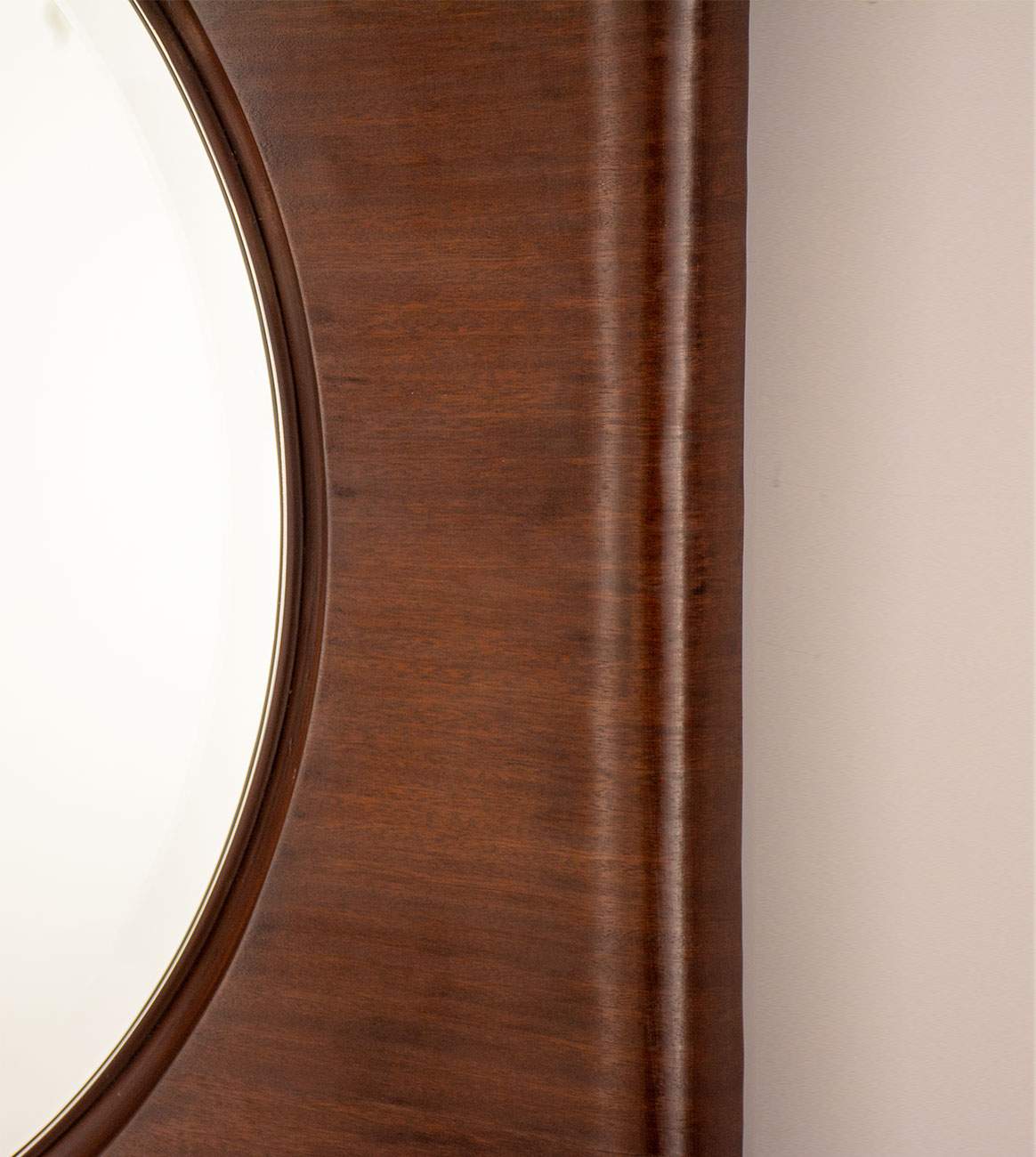 This round mirror is set in a custom-crafted, custom-finished square wood frame.