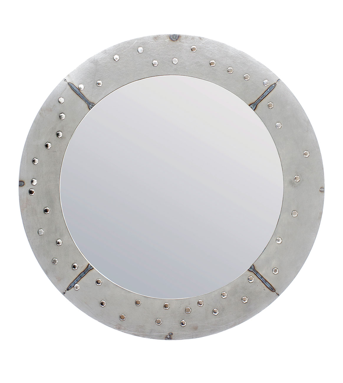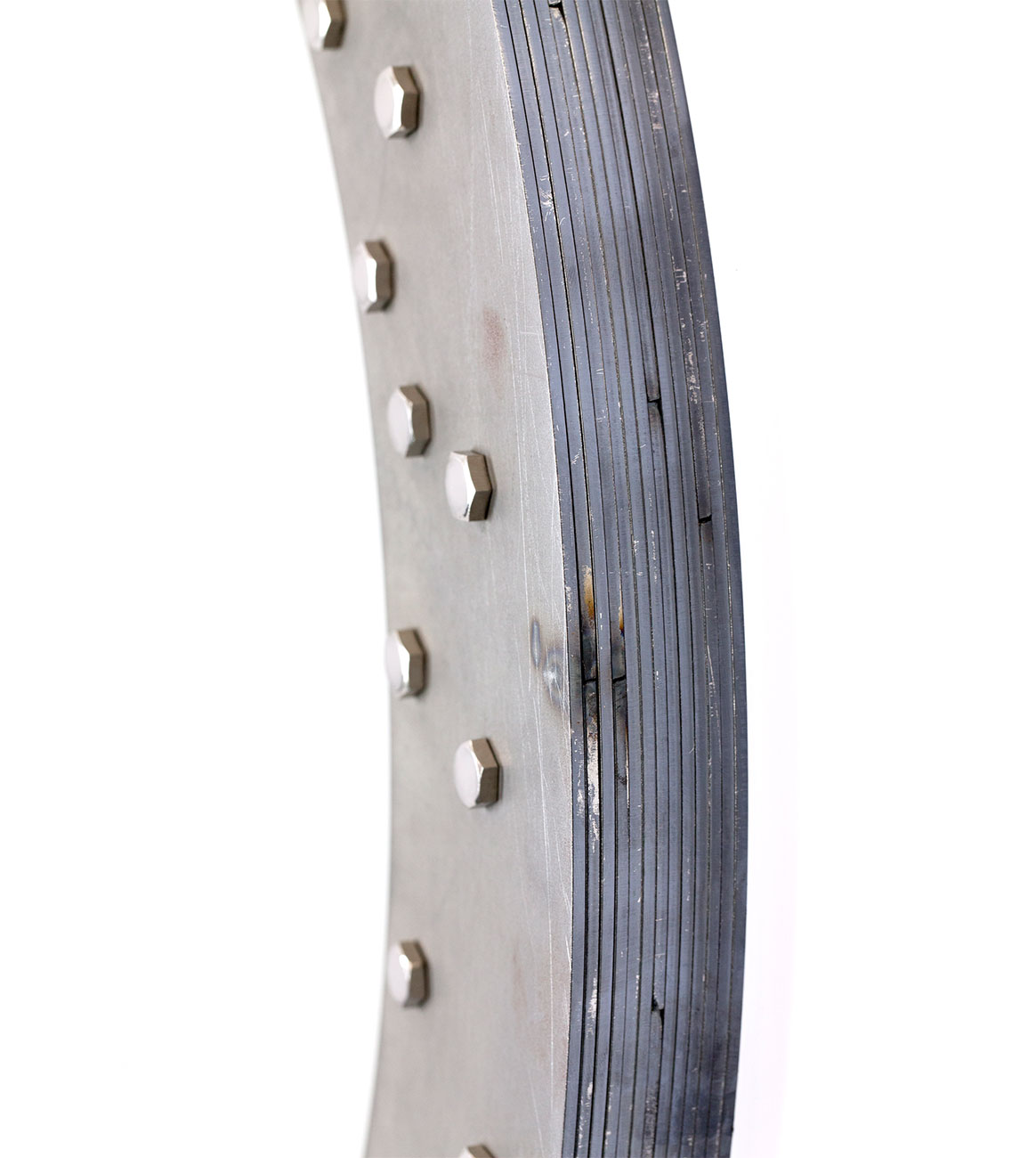 Features industrial welding of layered metal and decorative metal rivets.