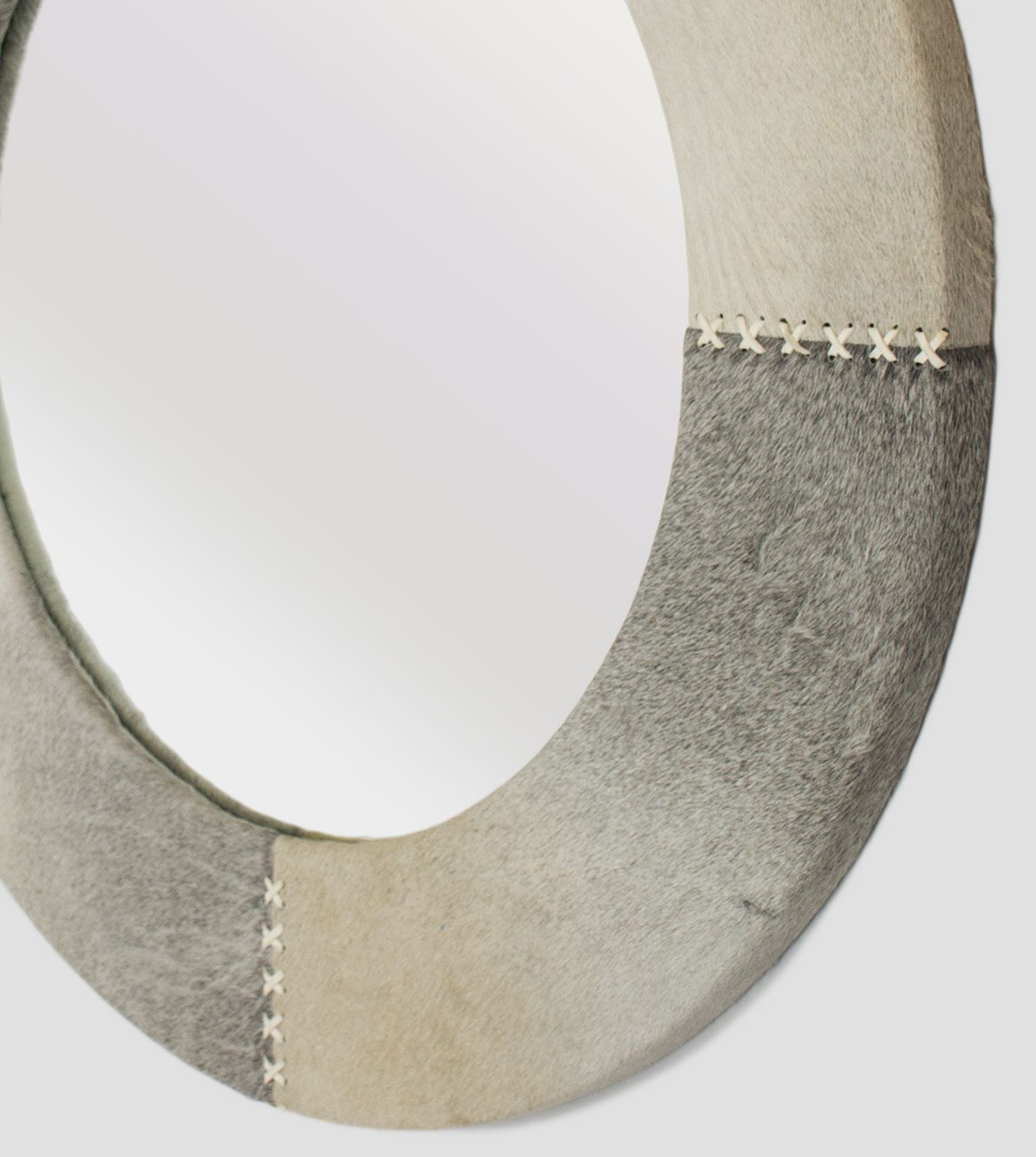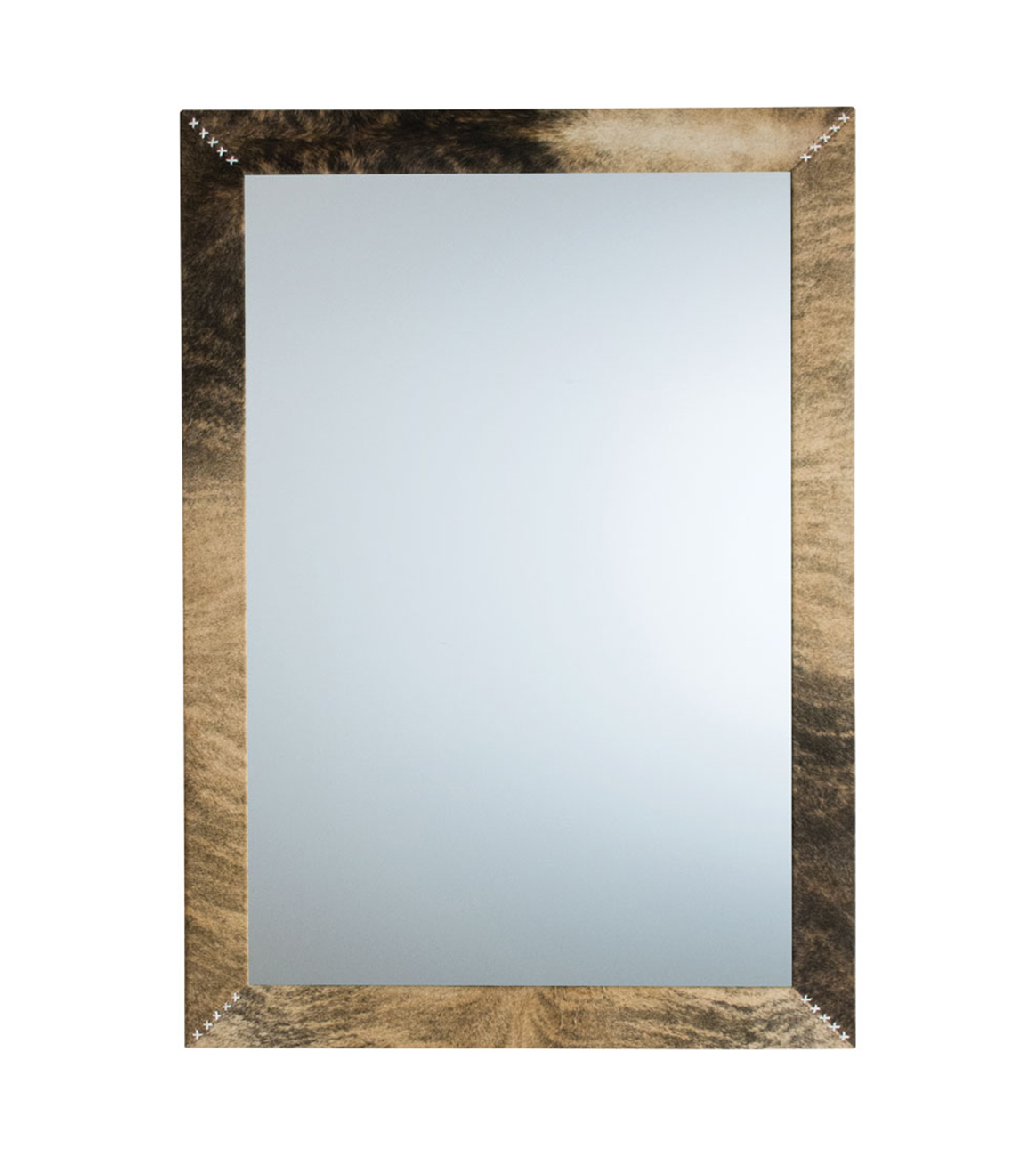 A custom cowhide-wrapped frame with leather stitching at corners.