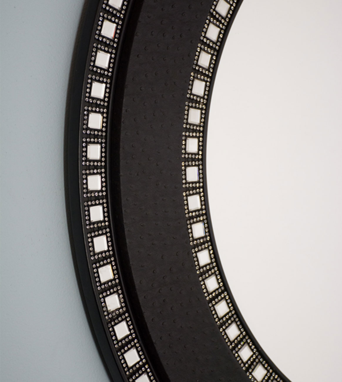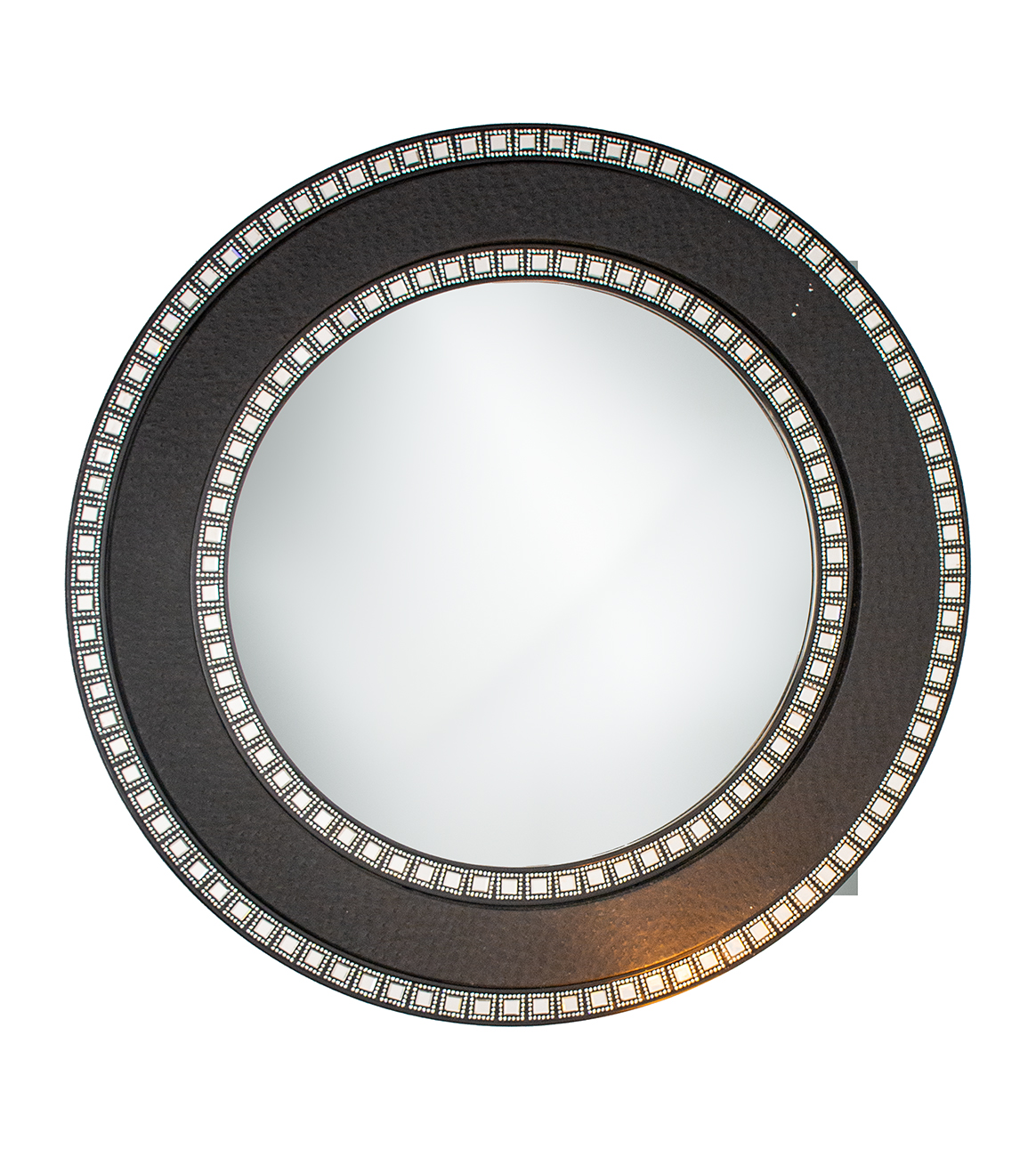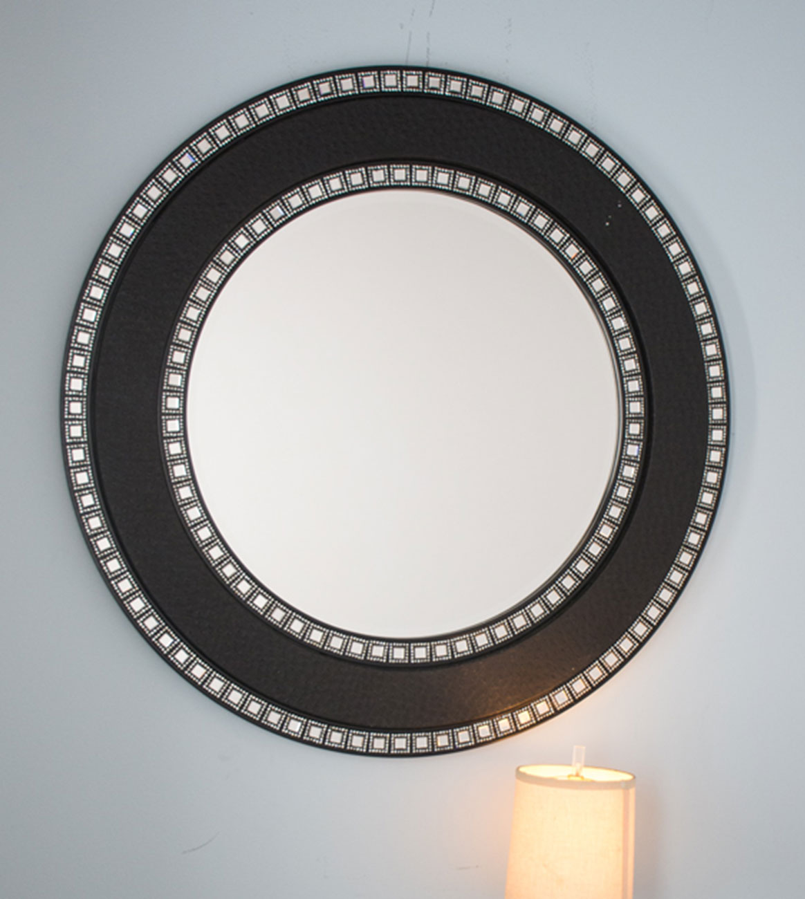 Leather-wrapped, textured round frame with two rows of decorative square mirrors and a clear mirror at the center.