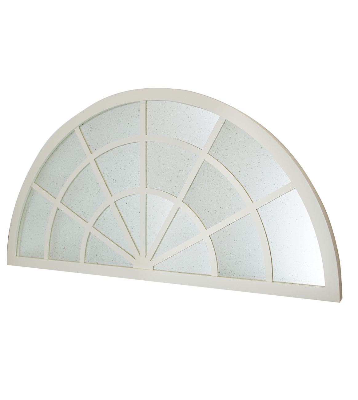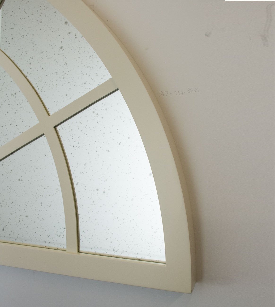 A half-round antique mirror with a mullion overlay custom finished in cream white.