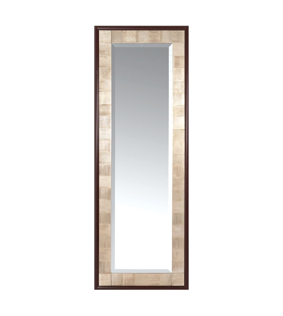 Features antique metal leaf over combed gesso and a walnut-colored finish at the perimeter.