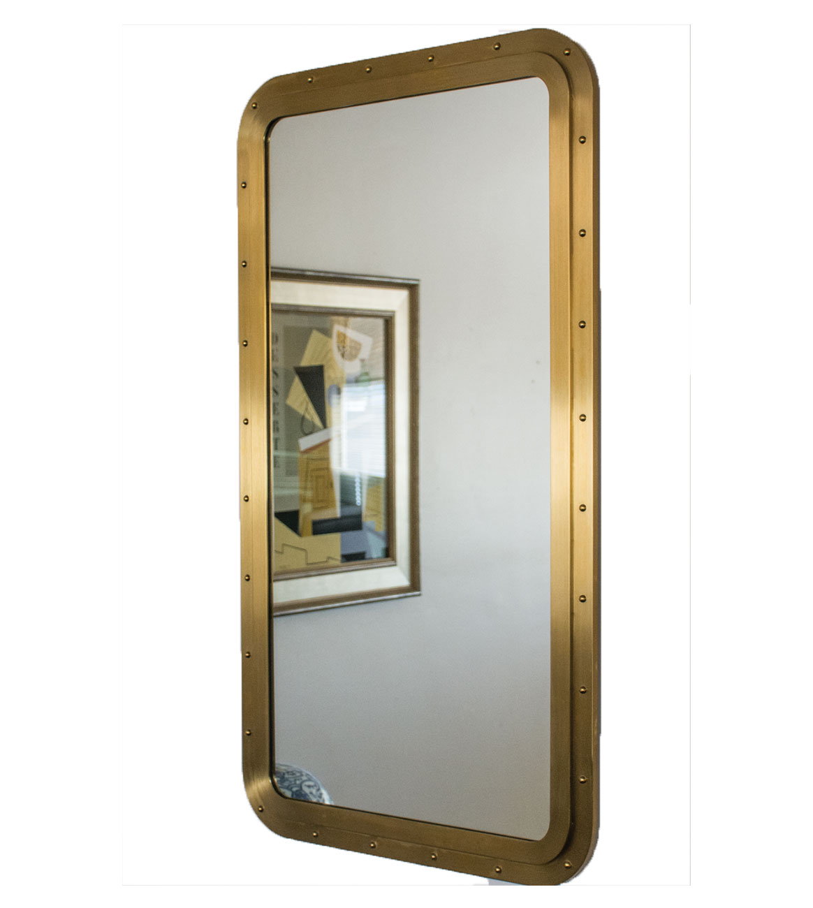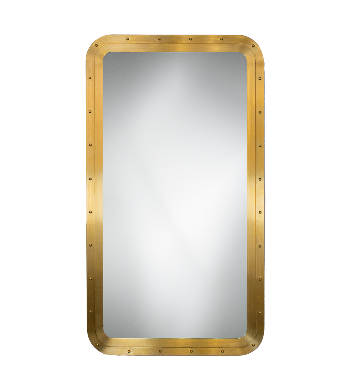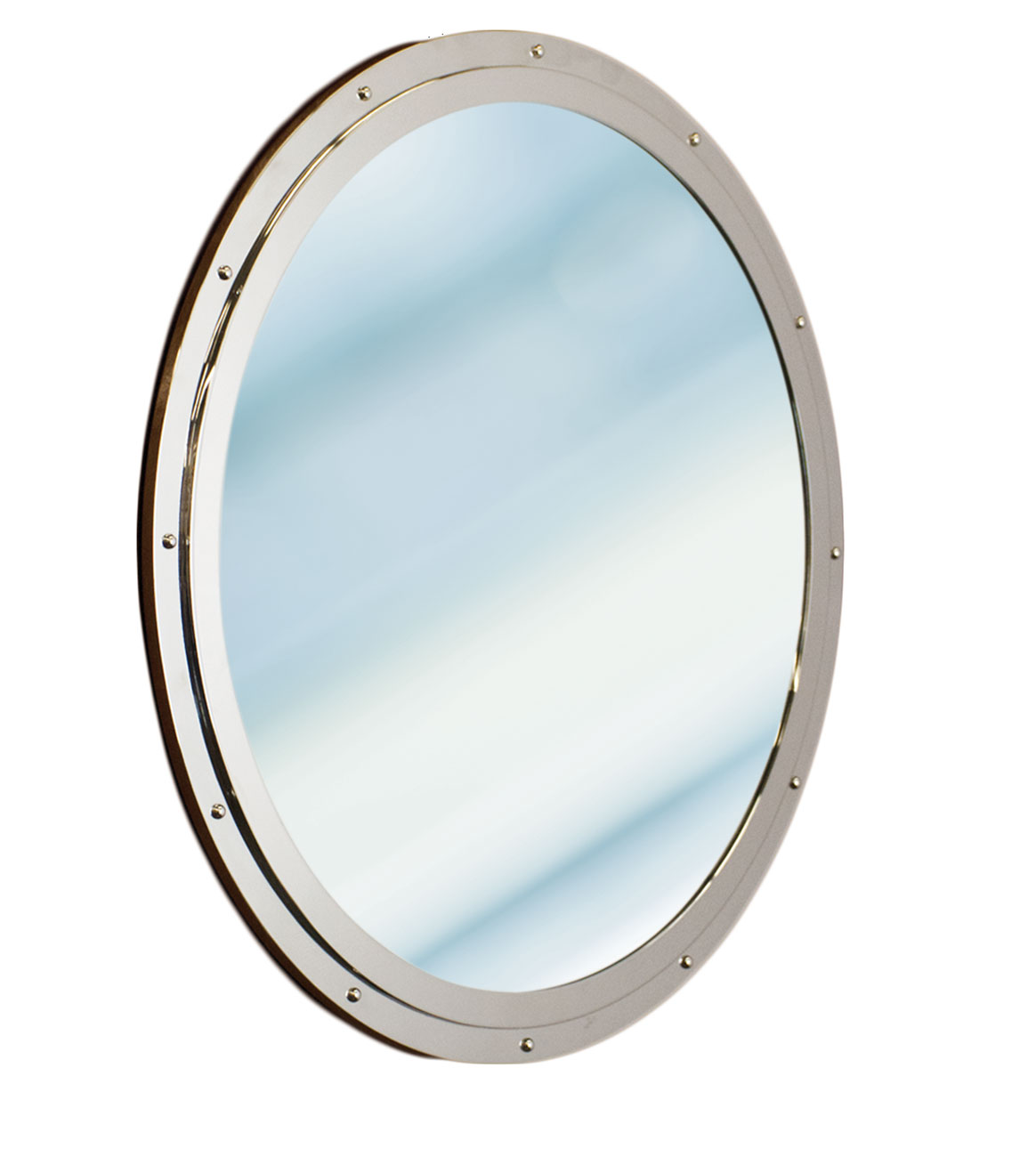 Round or rectangular stainless steel frame with applied rivets and a clear mirror at the center.
