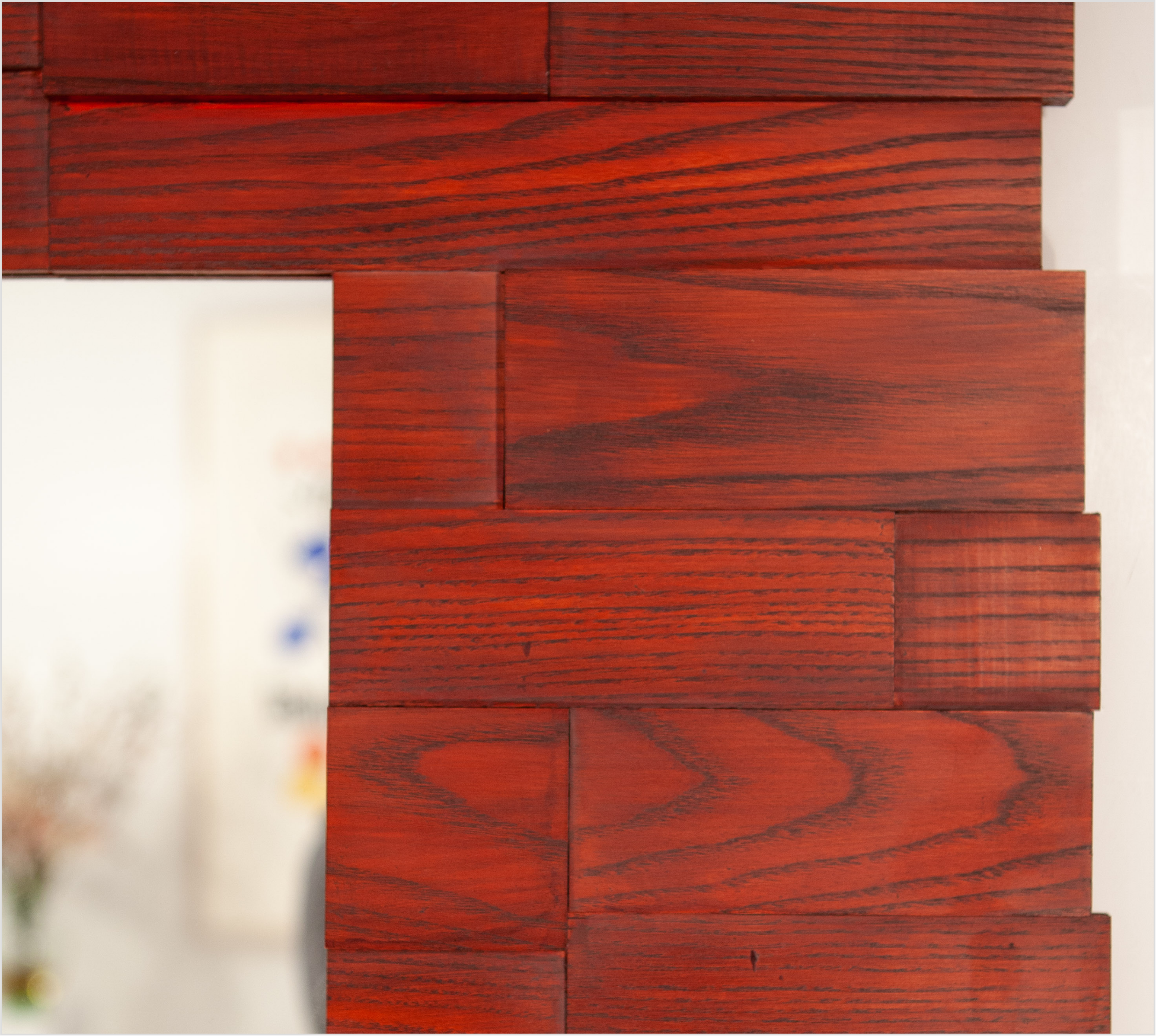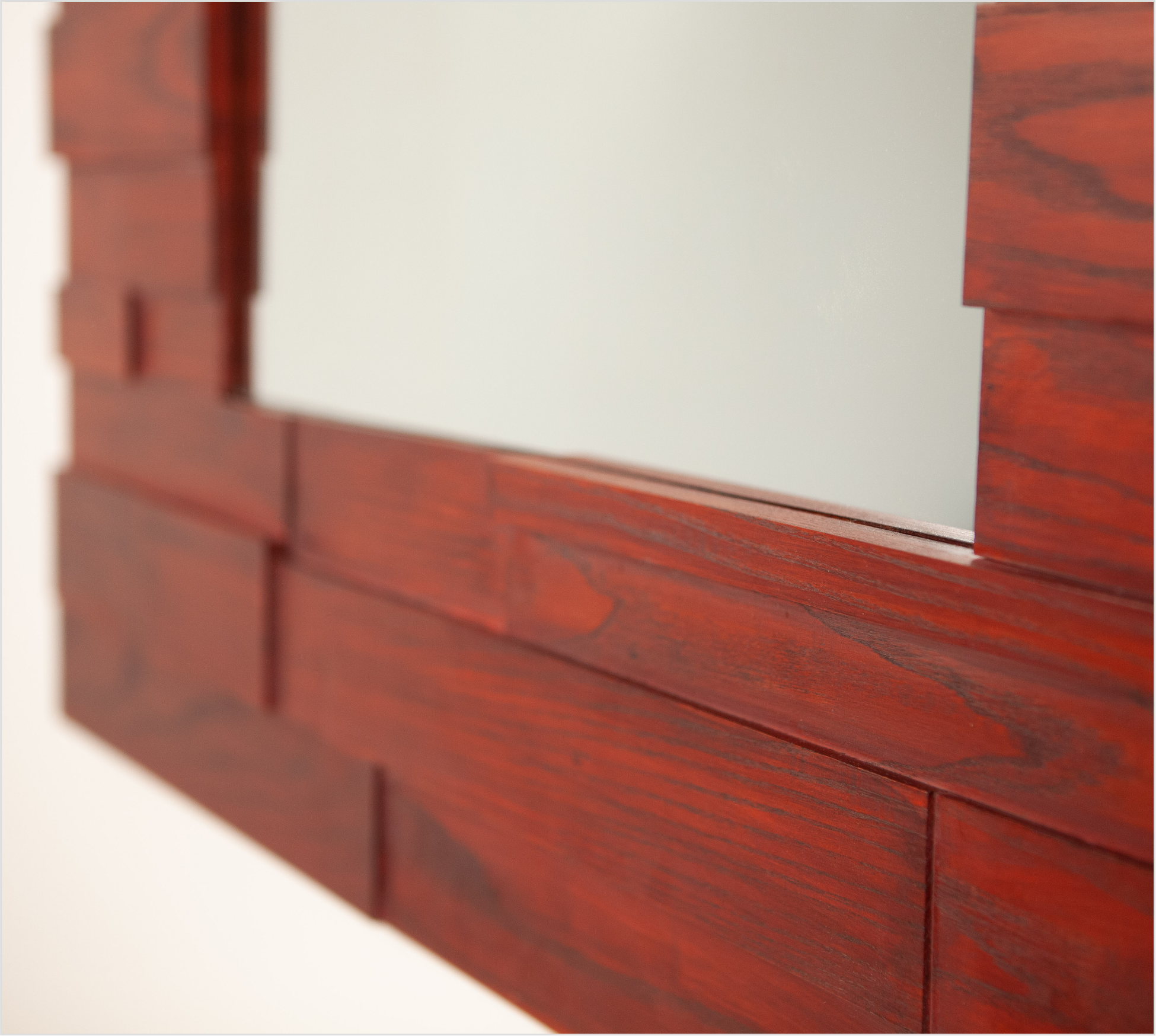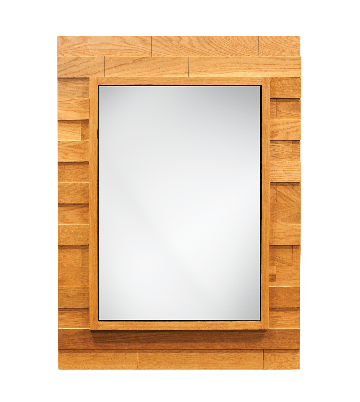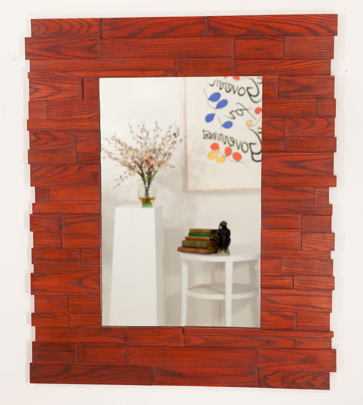 This framed mirror features a juxtaposition of a sophisticated floating polished-edged mirror and the rustic look of a board and batten wall.