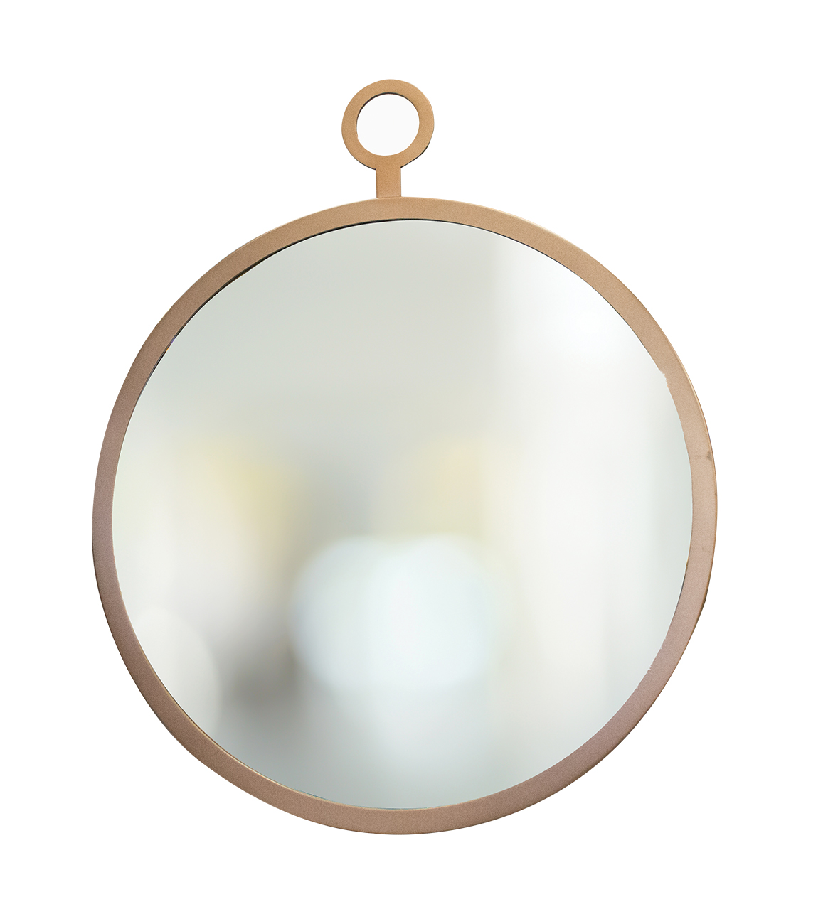 A simple and stylish round mirror with a custom-finished flat face wood frame with a decorative hanging ring.