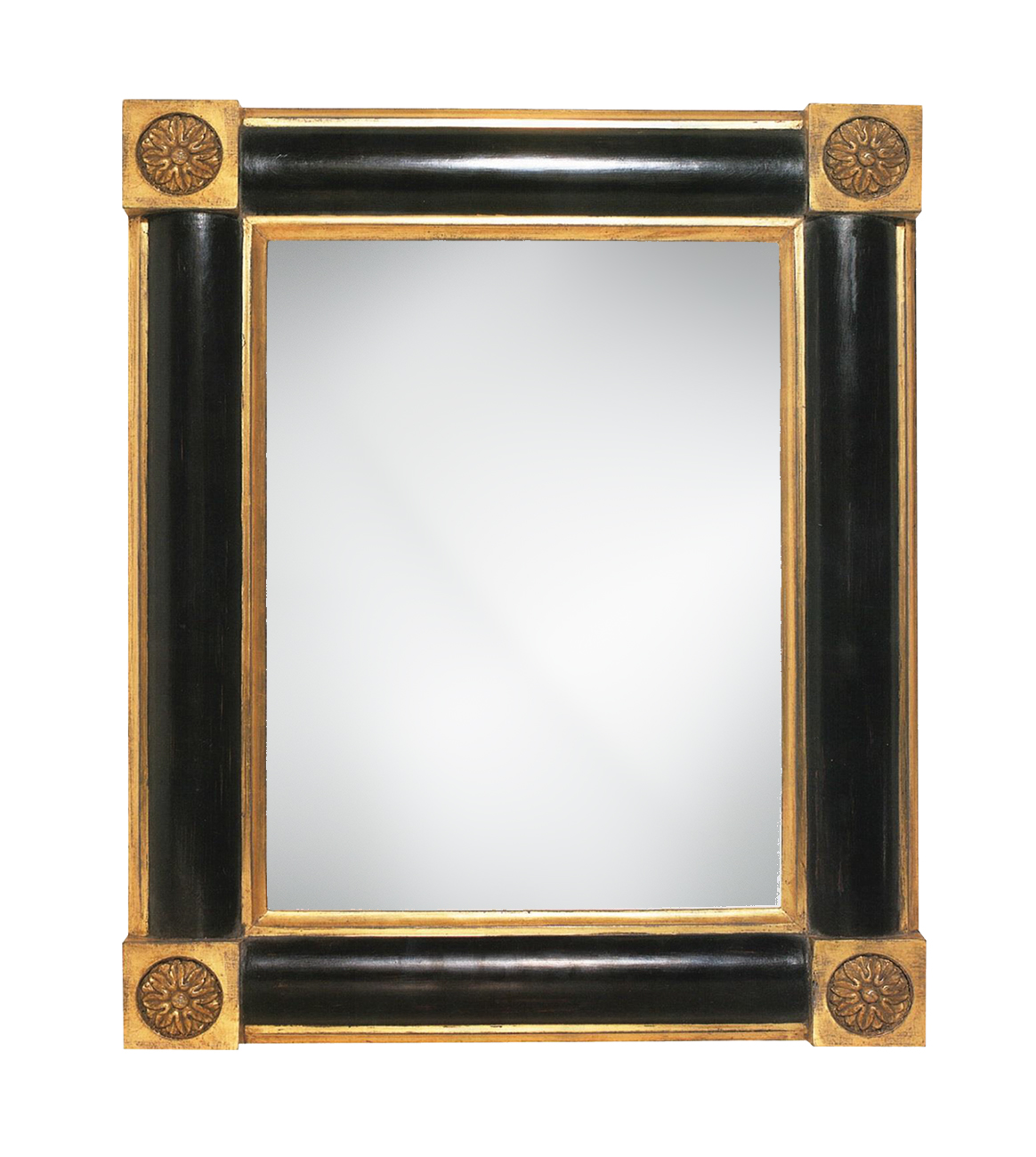 A rounded profile frame accented with rosette corner blocks finished in black and 22 karat gold leaf.