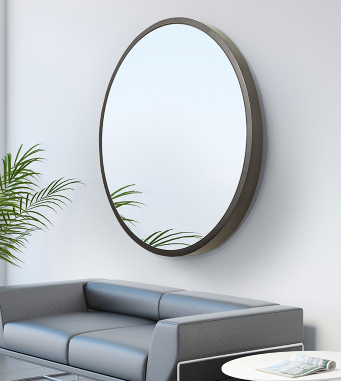 A modern frame, round with a sloping depth frame: 1-1/2” at the top and 4” deep at the bottom. Available in wood or metal.