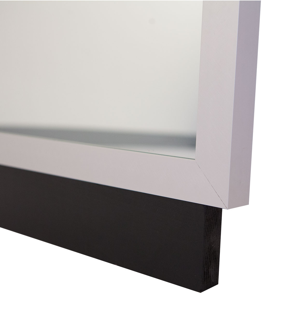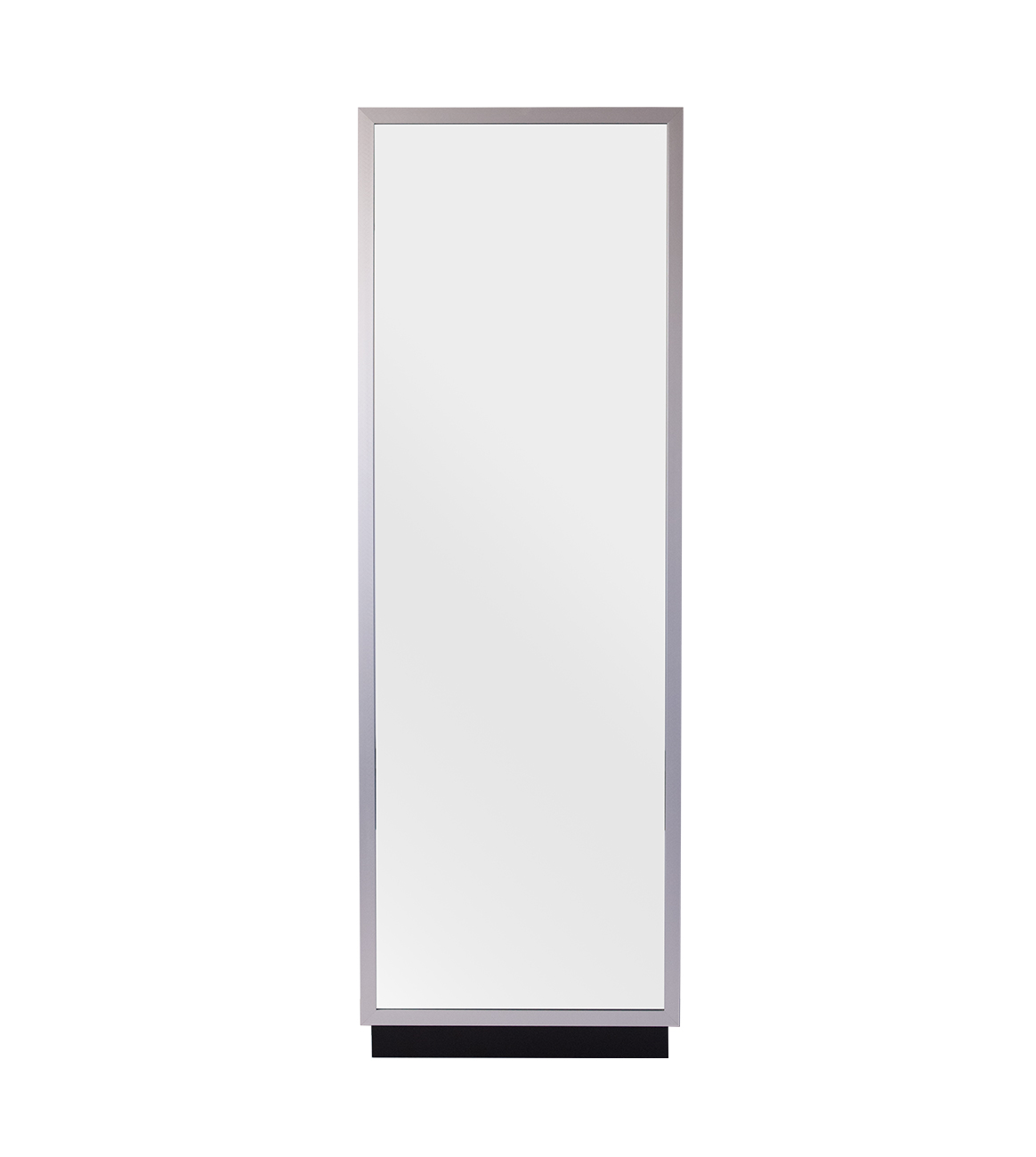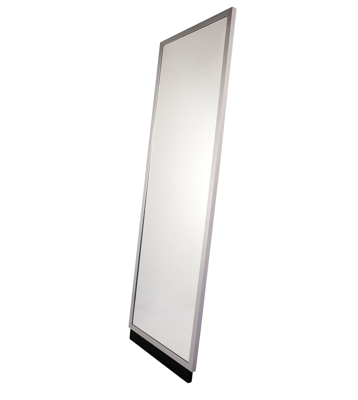 This full-length leaning mirror features a brushed steel frame and a black kick plate.