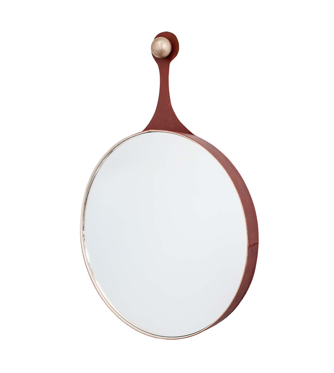 This round mirror is surrounded by a thin wood frame accented with a decorative leather hanging strap and wood peg.