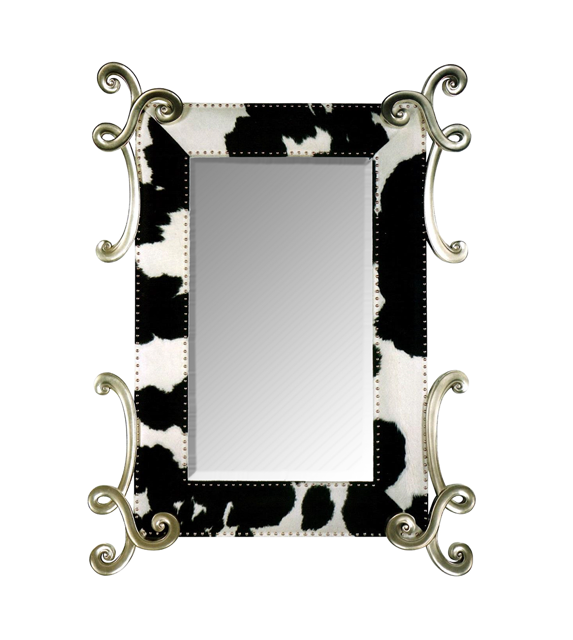 This flamboyant mirror features dyed steer hide, decorative nickel nail heads, and gold leaf corner decorative scrolls.