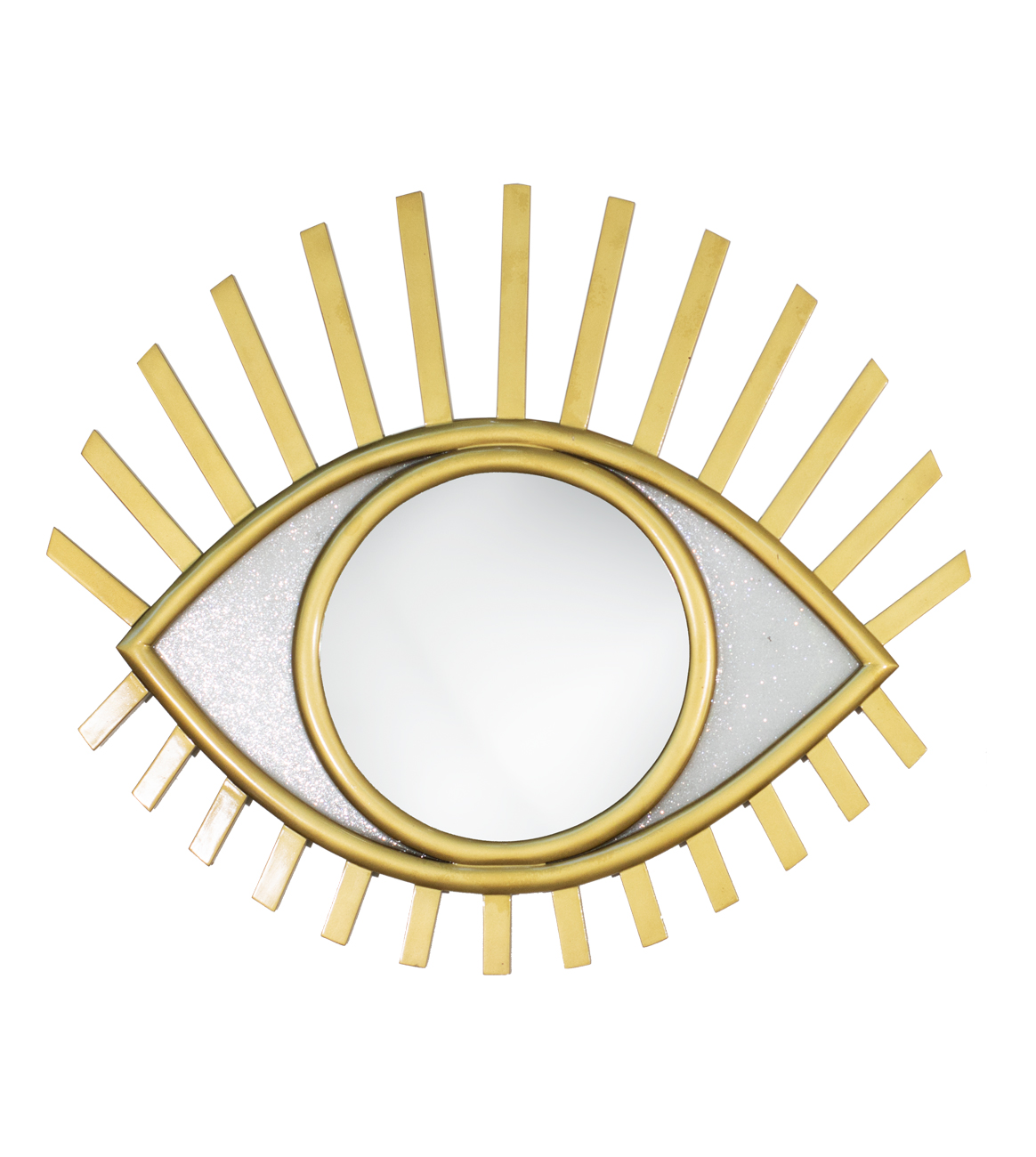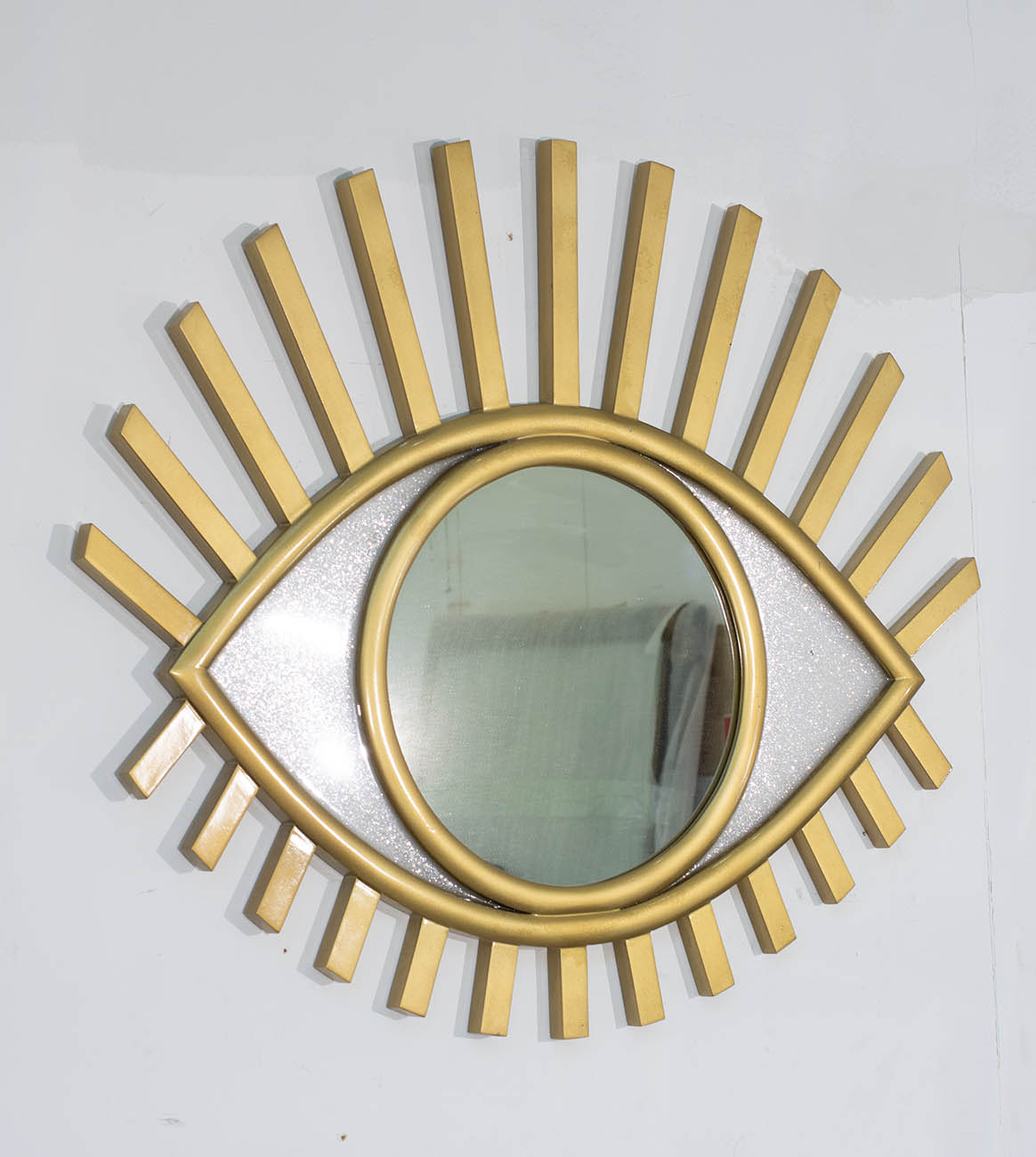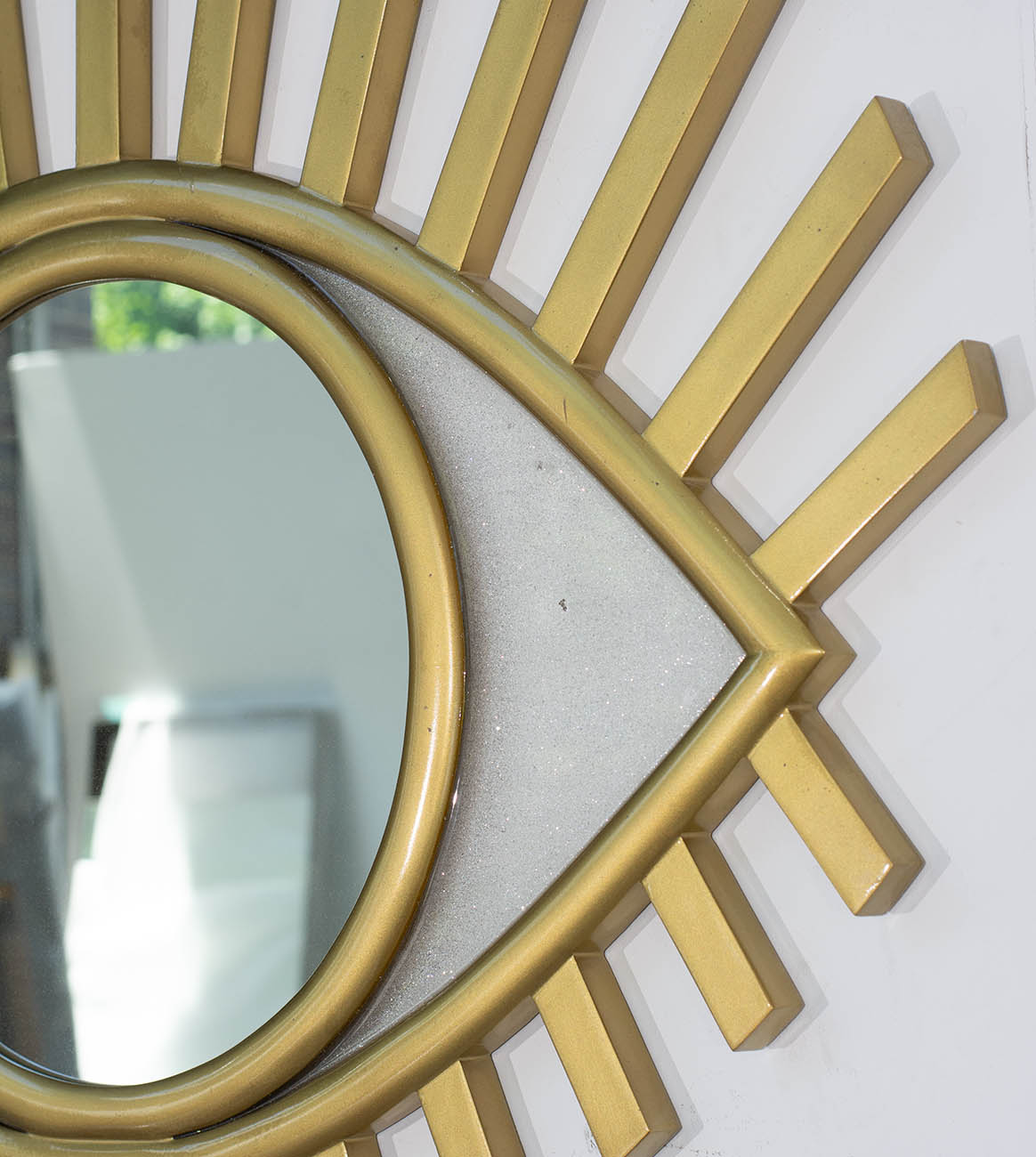 Custom eye-shaped wood frame finished with pearlescent gold.