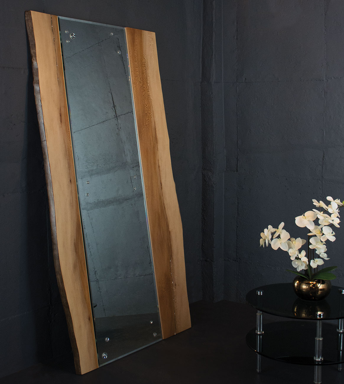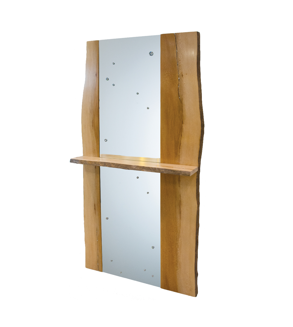 A natural wax-sealed finish on a full-length American Sycamore wood frame with inset Swarovski crystals in natural end-splits.