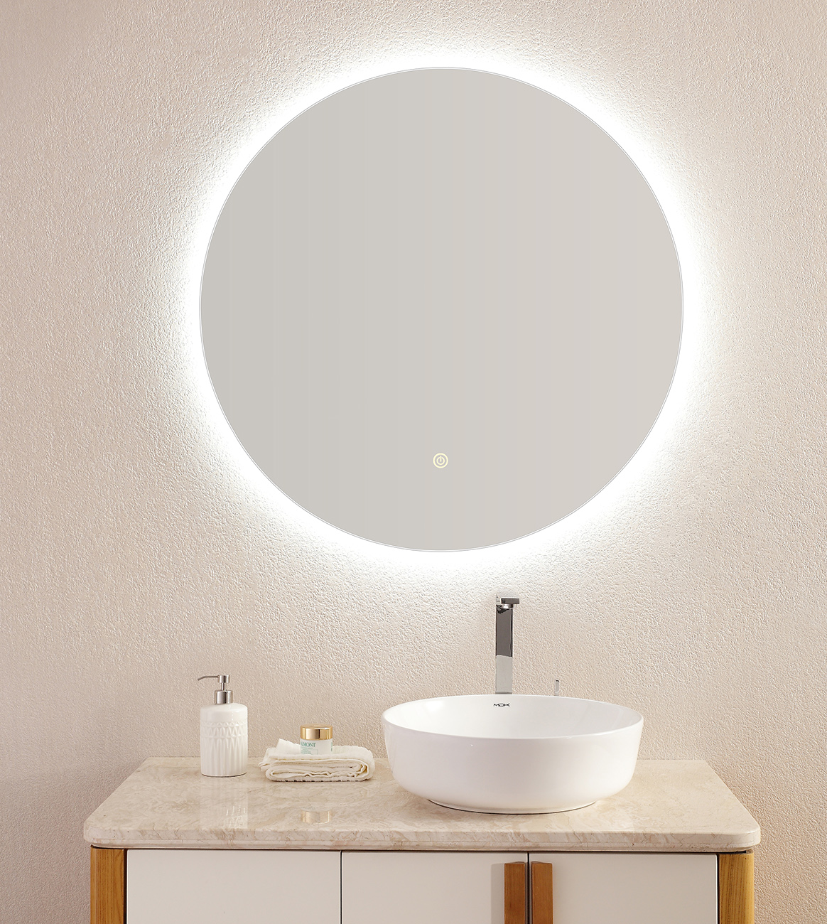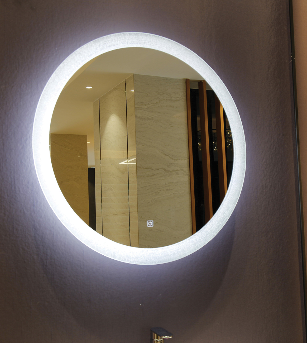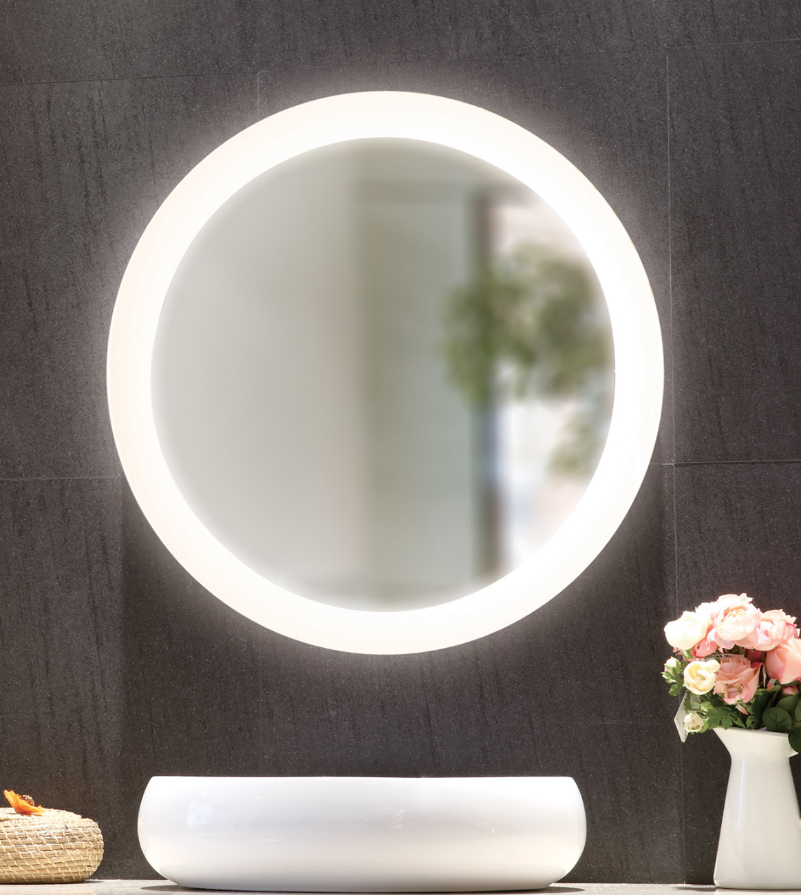 Mirror with high-efficiency LED backlighting.