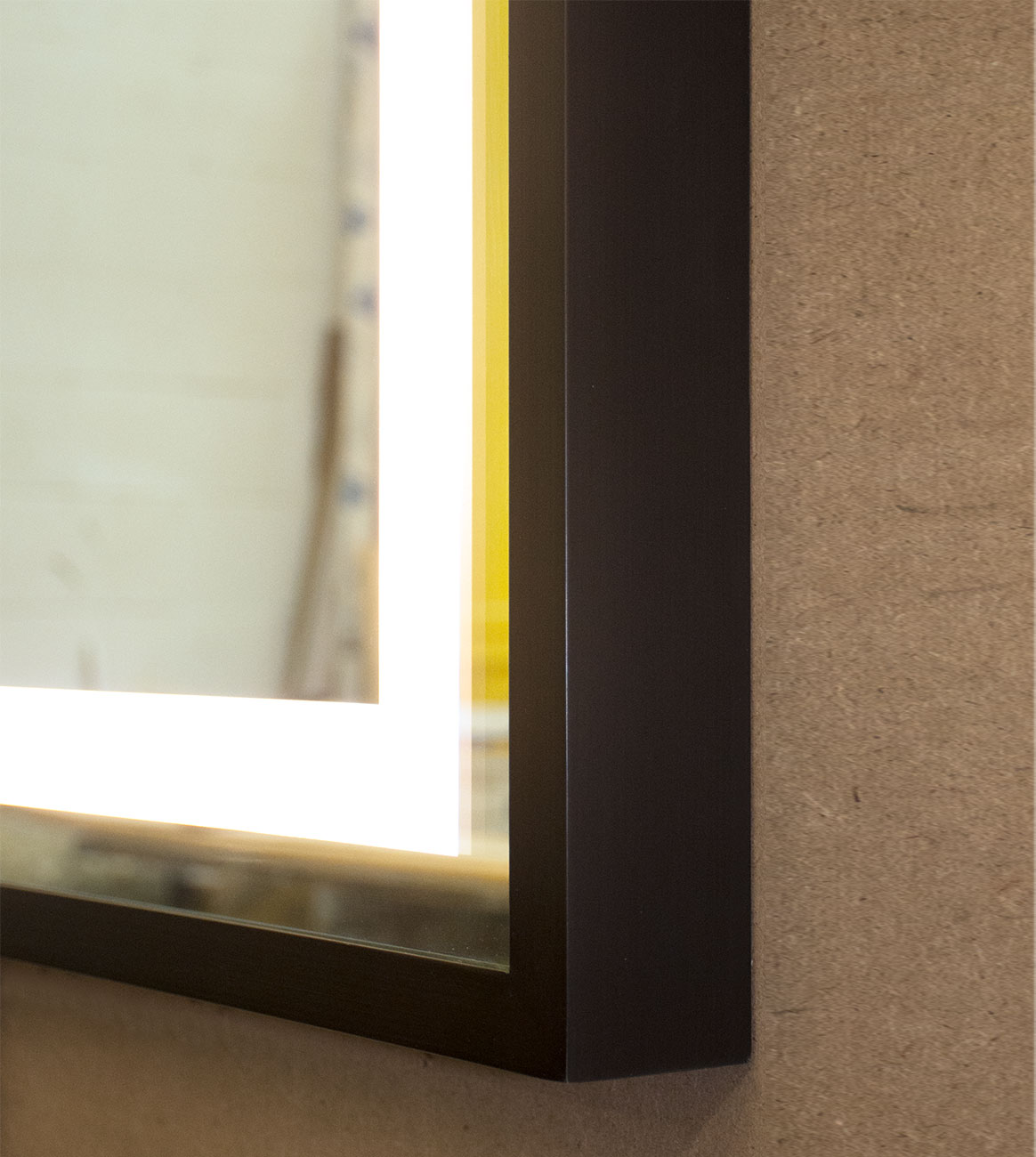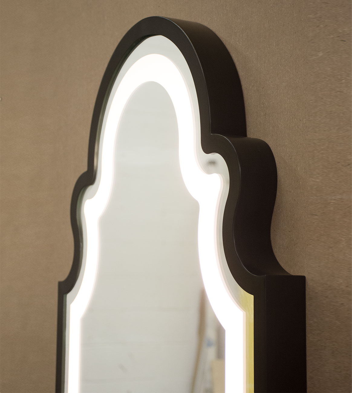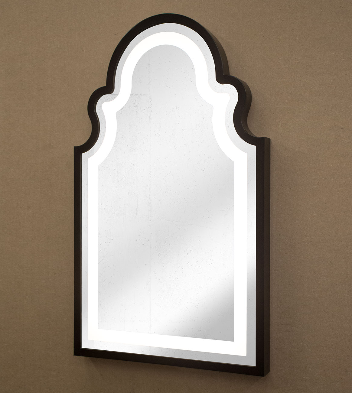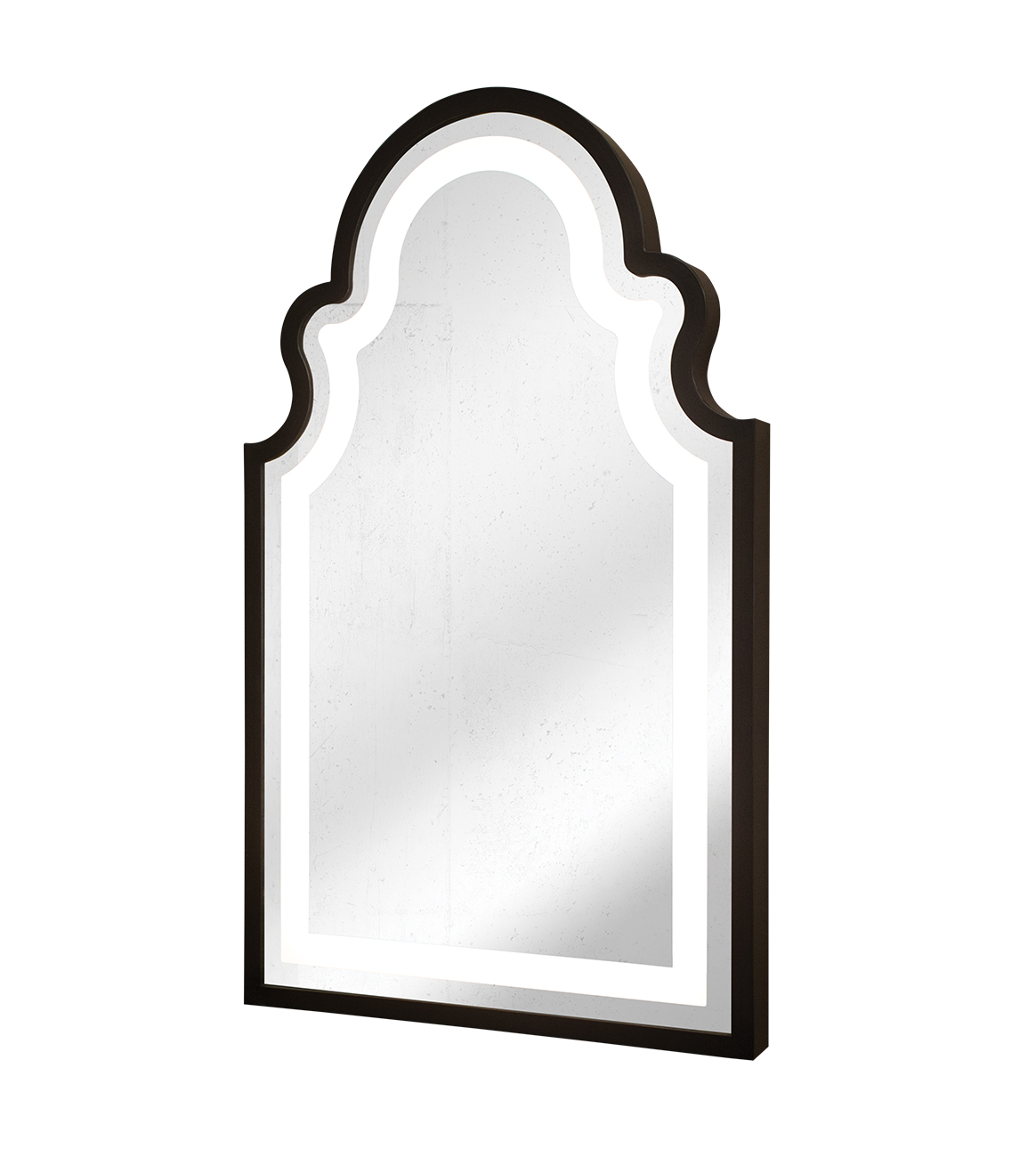 A classic traditional shape reinvented with a modern sensibility and a back-lit mirror, the back-etched border follows the shape of the frame.