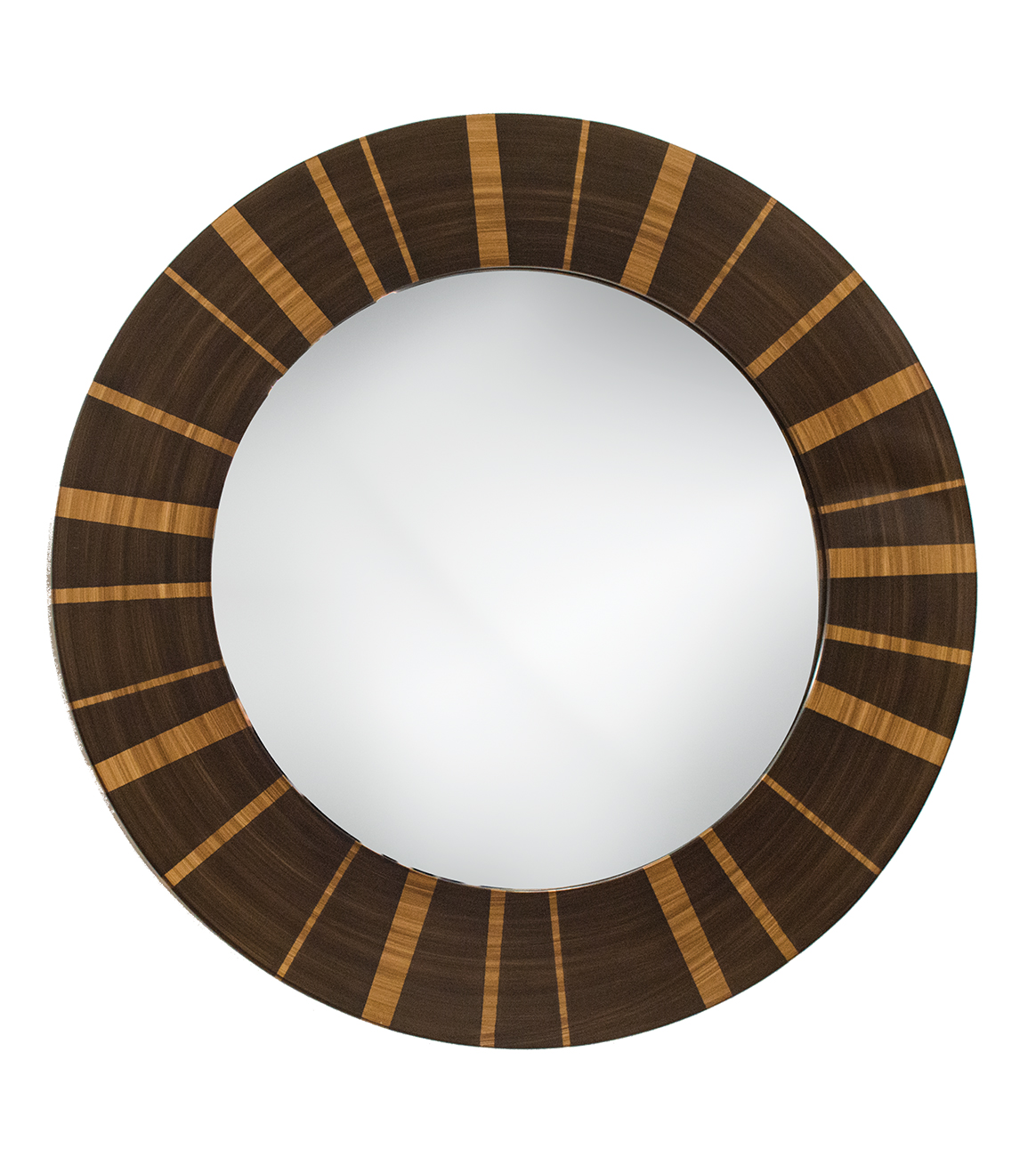This round framed mirror features a custom finish to mimic the exotic wenge hardwood grain and coloration.